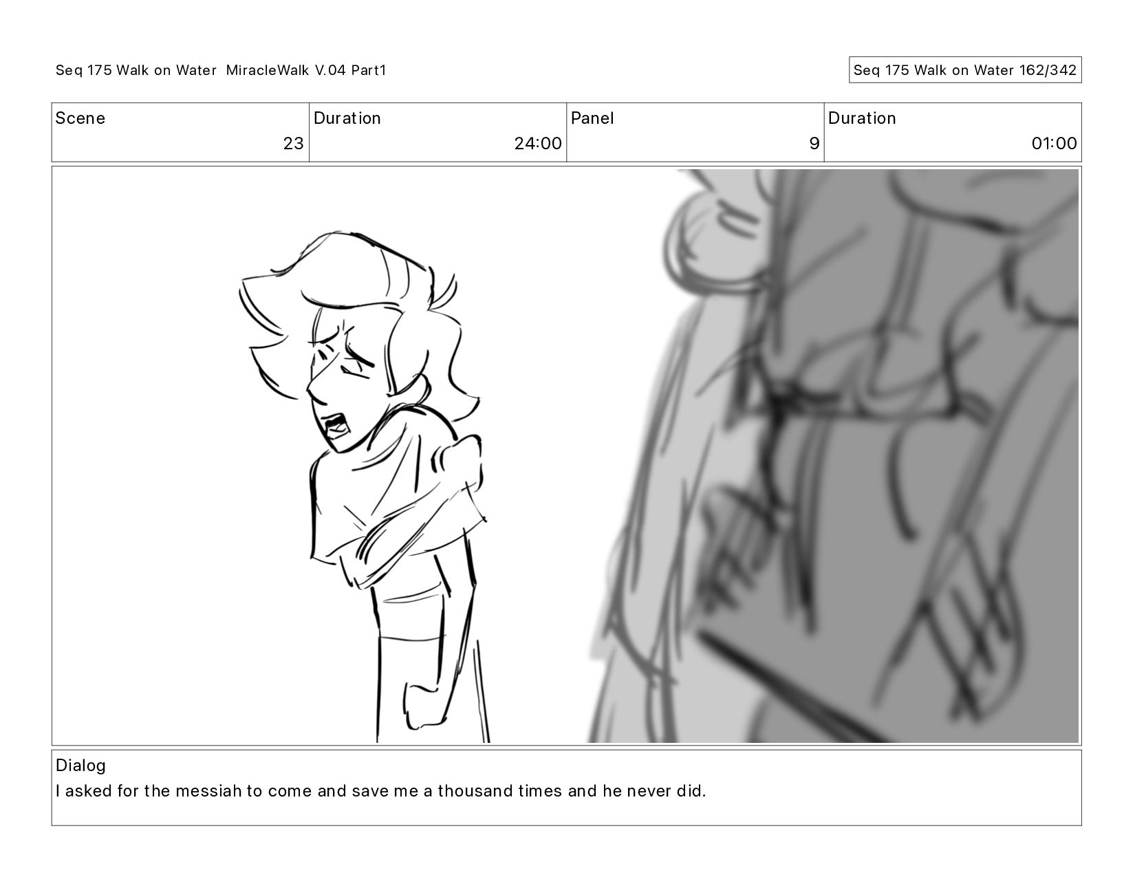 Dialog I asked for the messiah to come and save me a thousand times and he never did. Seq 175 Walk on Water MiracleWalk V.04 Part1 Seq 175 Walk on Water 163/342