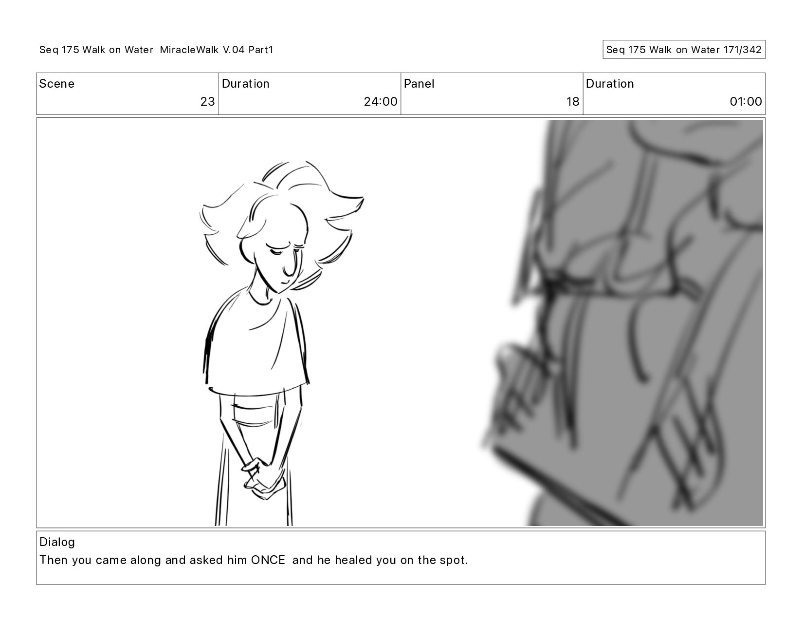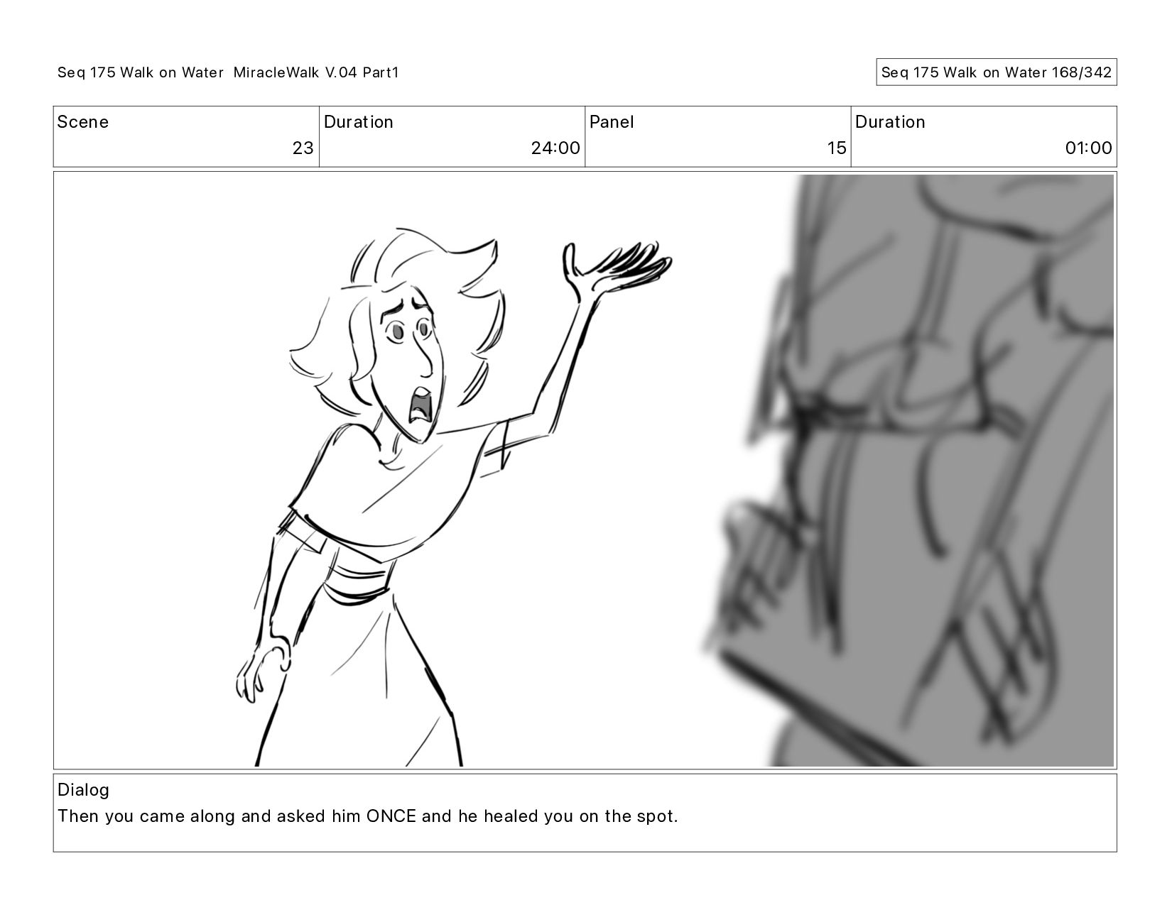 Dialog Then you came along and asked him ONCE and he healed you on the spot. Seq 175 Walk on Water MiracleWalk V.04 Part1 Seq 175 Walk on Water 172/342
