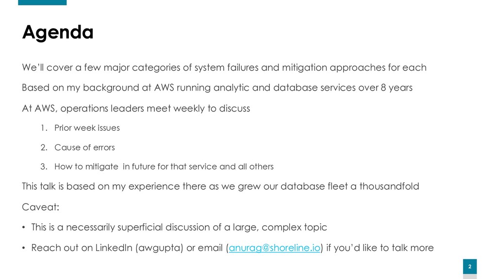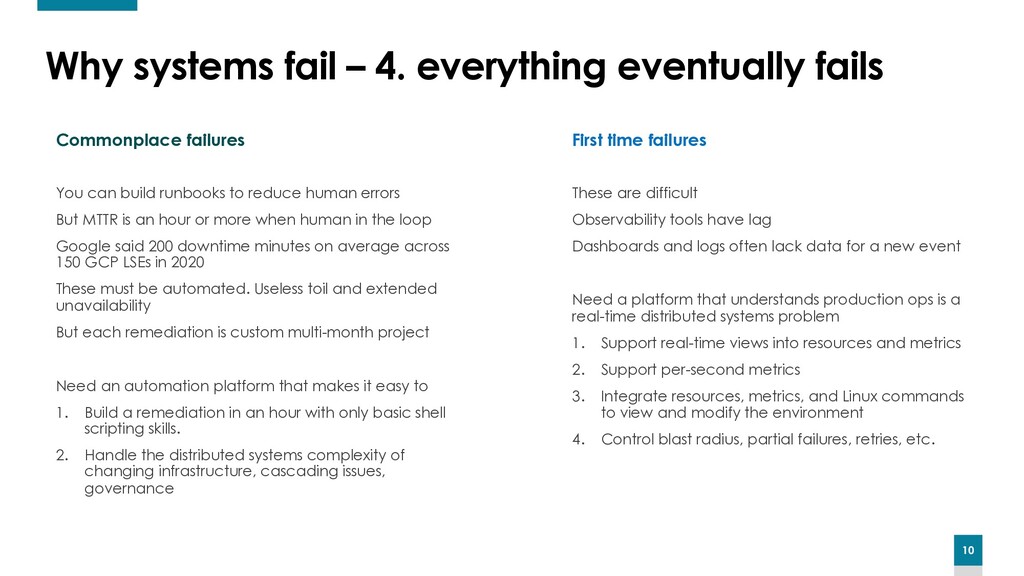 In this session, I’ll describe real outages I saw at AWS, group them into characteristic causes, and describe how we reduced tickets, improved availability, and reduced costs while growing our fleet 1000x. You’ll walk away with concrete ideas that you can put into place to improve availability and reduce burnout.