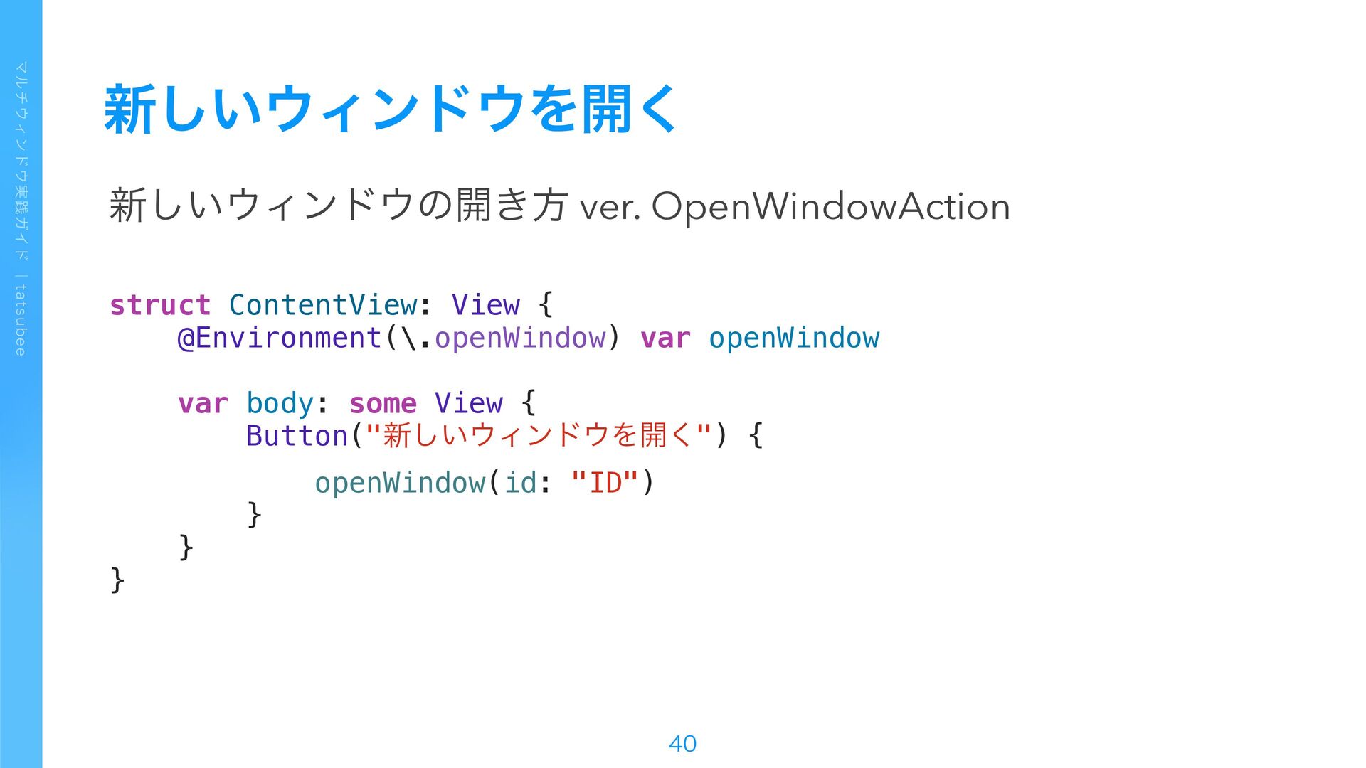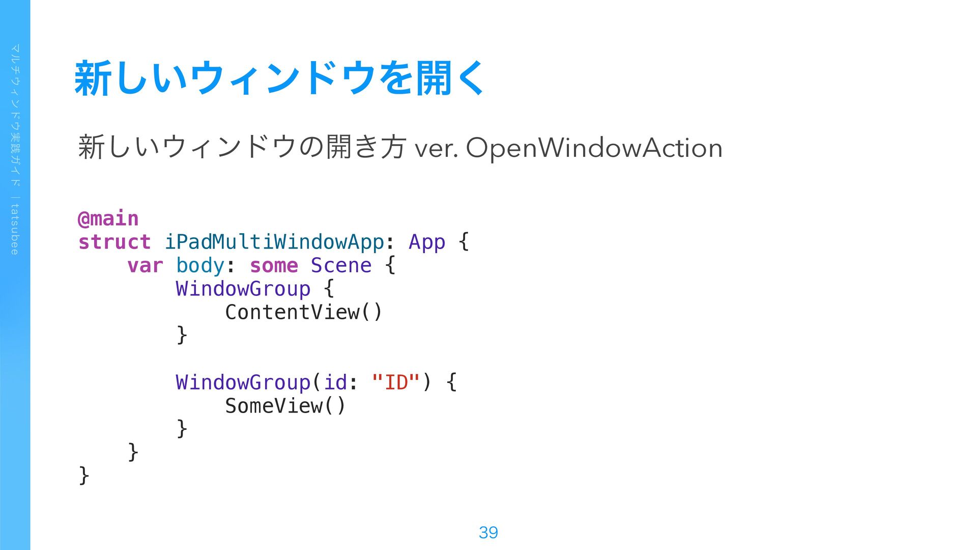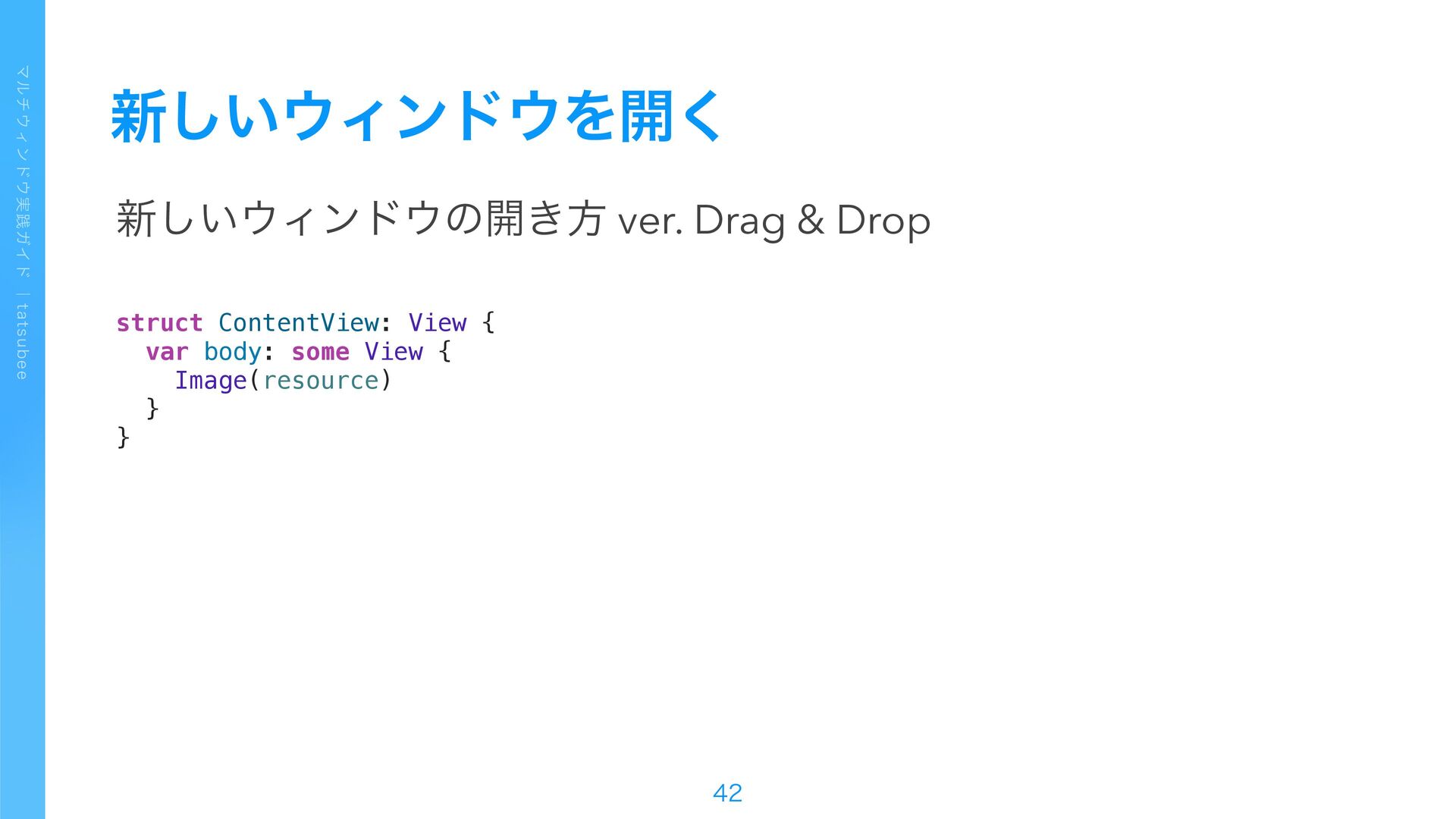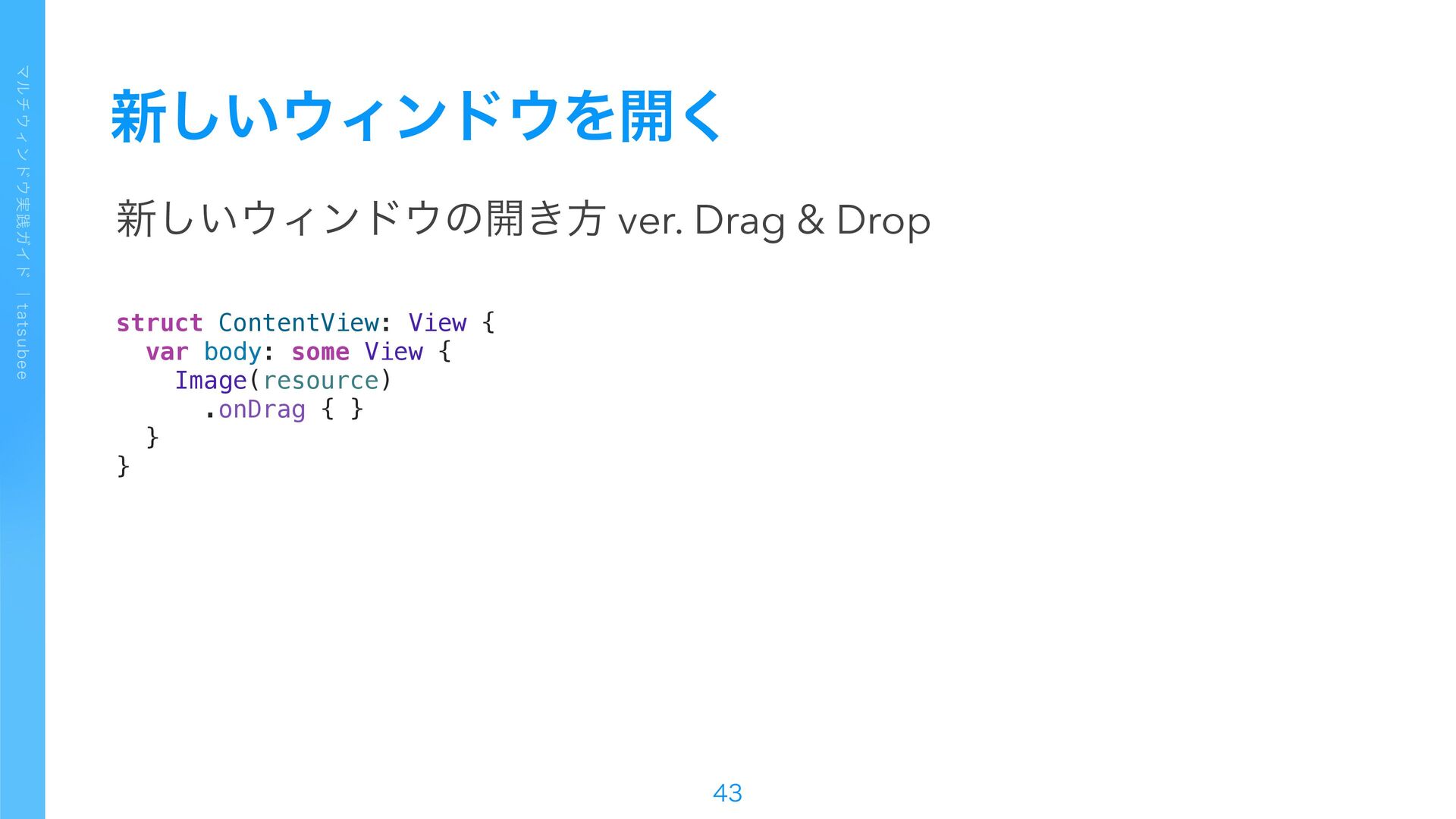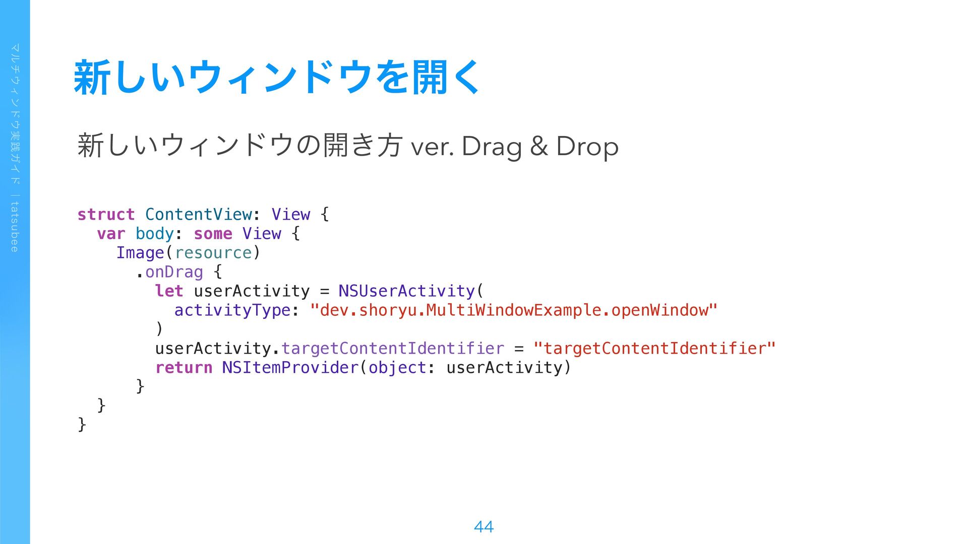 var body: some View { Image(resource) .onDrag { let userActivity = NSUserActivity( activityType: "dev.shoryu.MultiWindowExample.openWindow" ) userActivity.targetContentIdentifier = "targetContentIdentifier" return NSItemProvider(object: userActivity) } } } ϚϧνΟϯυ࣮ફΨΠυʛUBUTVCFF