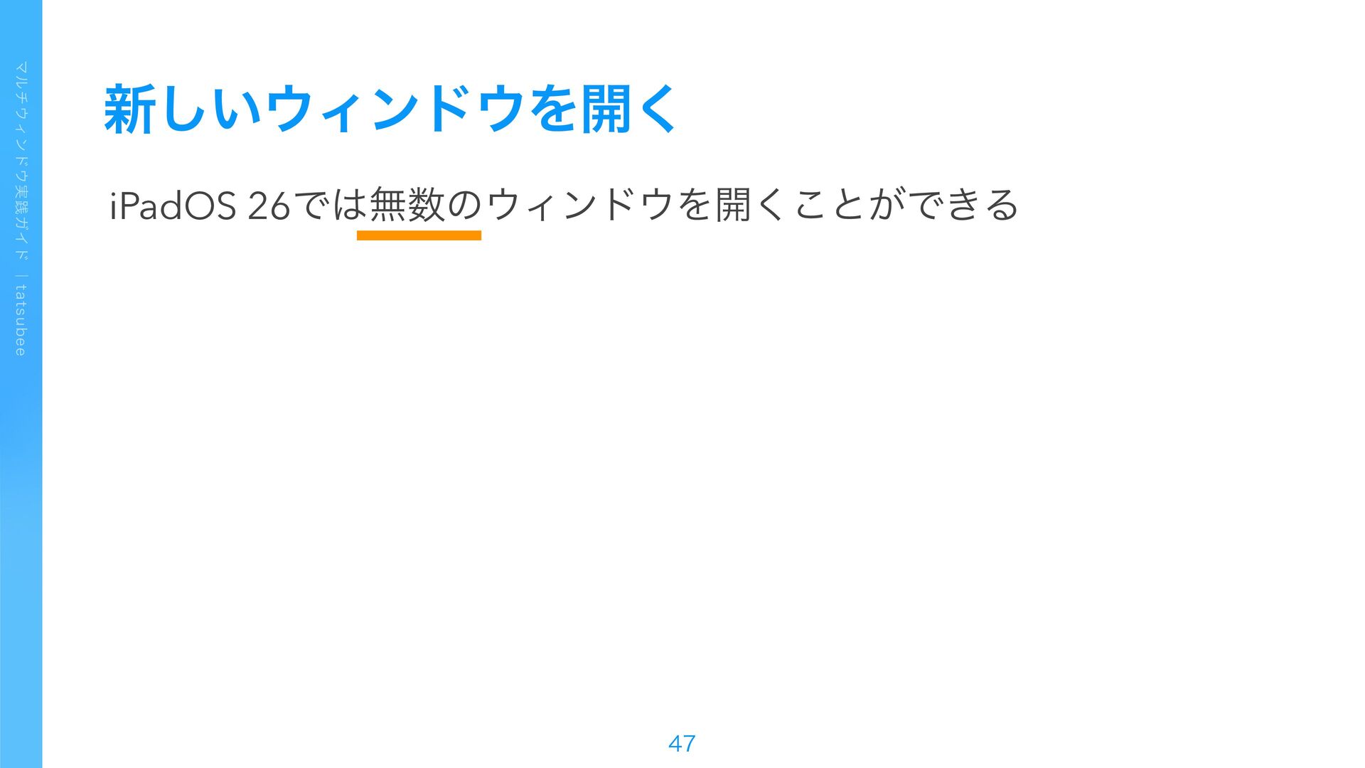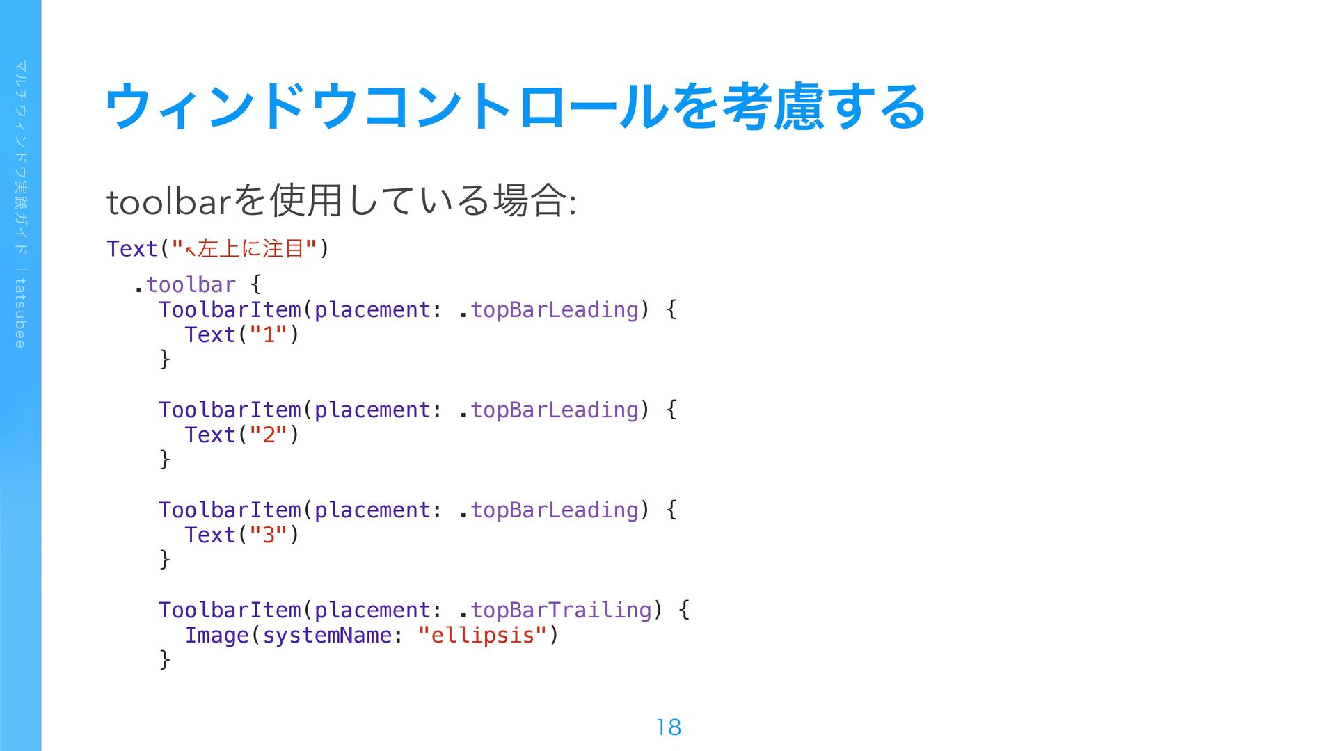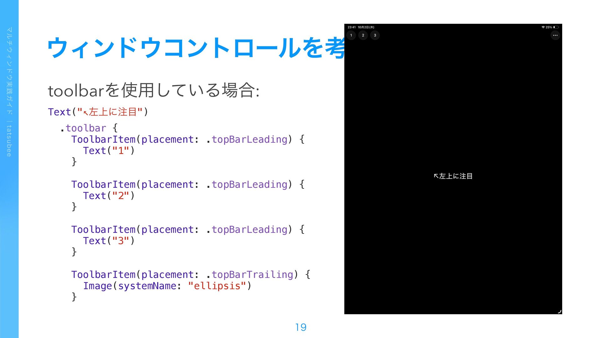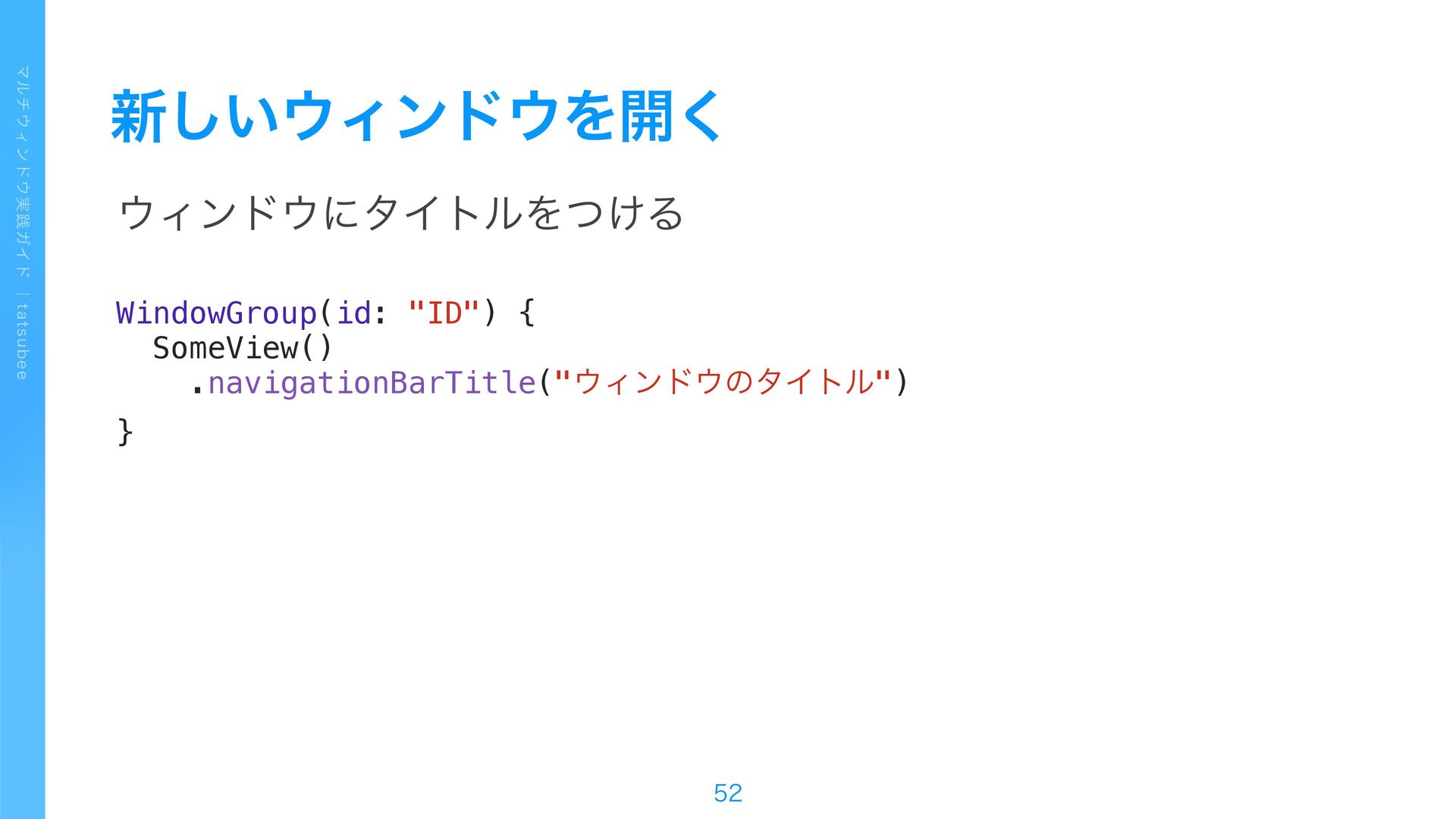 var body: some View { Image(resource) .onDrag { let userActivity = NSUserActivity( activityType: "dev.shoryu.MultiWindowExample.openWindow" ) userActivity.targetContentIdentifier = "targetContentIdentifier" return NSItemProvider(object: userActivity) } } } ϚϧνΟϯυ࣮ફΨΠυʛUBUTVCFF