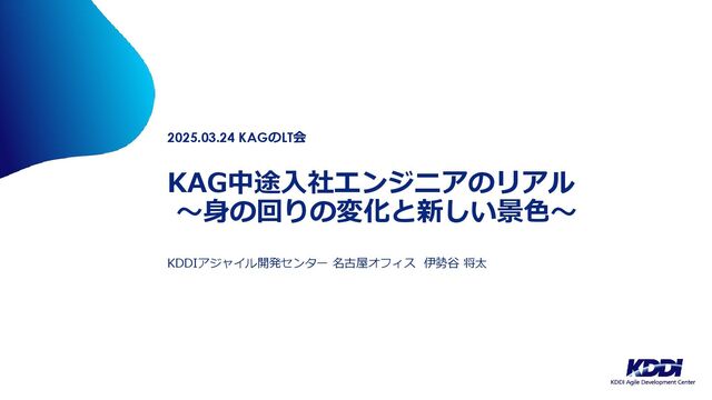 KAG中途入社エンジニアのリアル 〜身の回りの変化と新しい景色〜 2025.03.24 KAGのLT会 KDDIアジャイル開発センター 名古屋オフィス 伊勢谷 将太