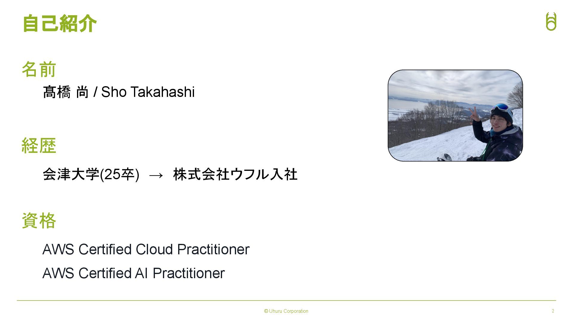 会津大学(25卒) → 株式会社ウフル入社 資格 AWS Certified Cloud Practitioner AWS Certified AI Practitioner 2 自己紹介