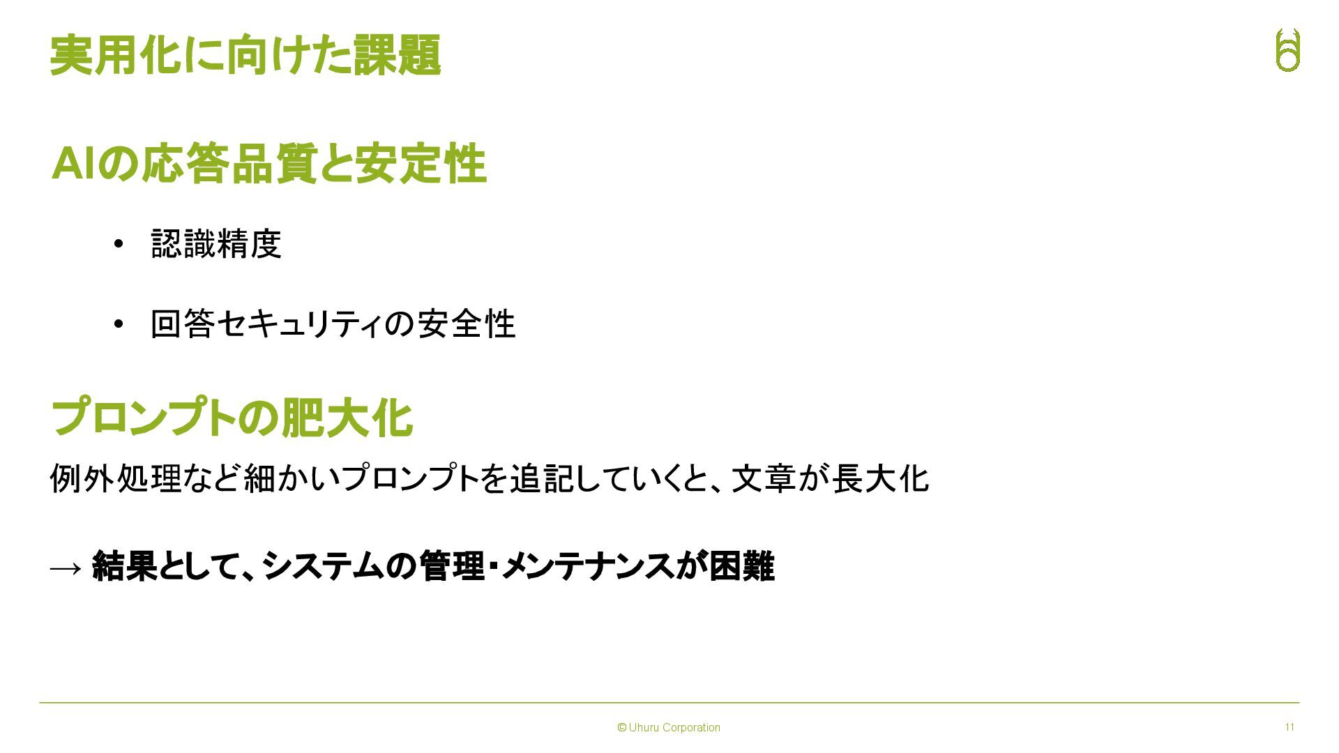 © Uhuru Corporation AIの応答品質と安定性 • 認識精度 • 回答セキュリティの安全性 プロンプトの肥大化 例外処理など細かいプロンプトを追記していくと、文章が長大化