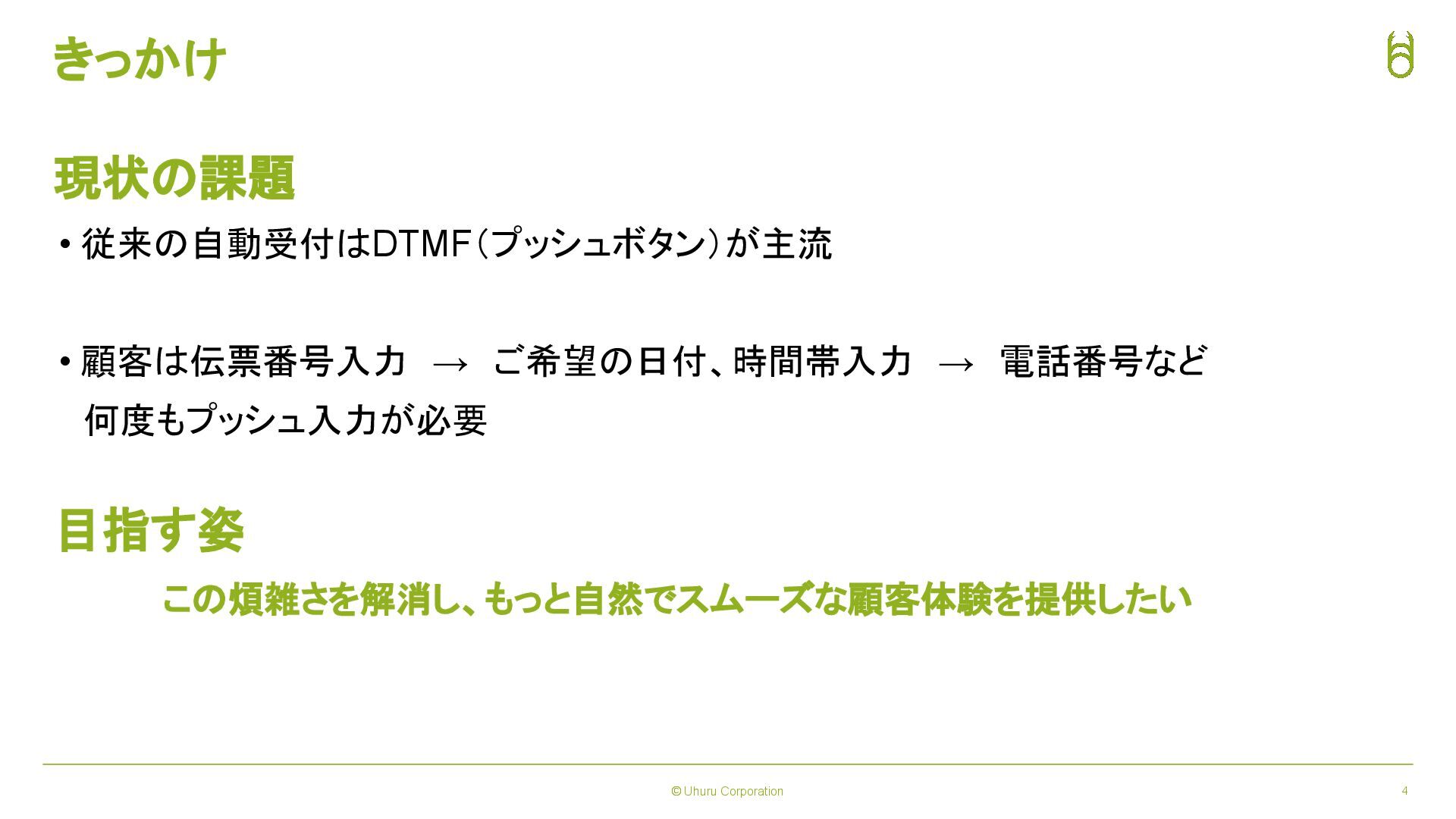 © Uhuru Corporation 現状の課題 • 従来の自動受付はDTMF(プッシュボタン)が主流 • 顧客は伝票番号入力 → ご希望の日付、時間帯入力 → 電話番号など 何度もプッシュ入力が必要 目指す姿