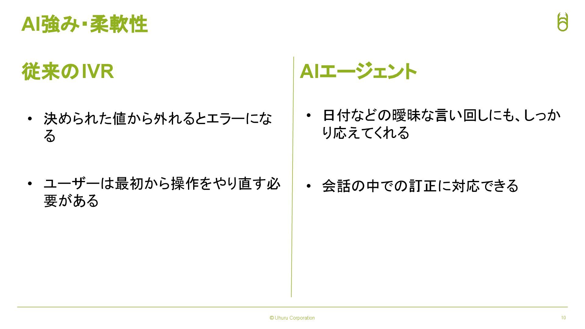 © Uhuru Corporation 10 AI強み・柔軟性 従来のIVR • 決められた値から外れるとエラーにな る •