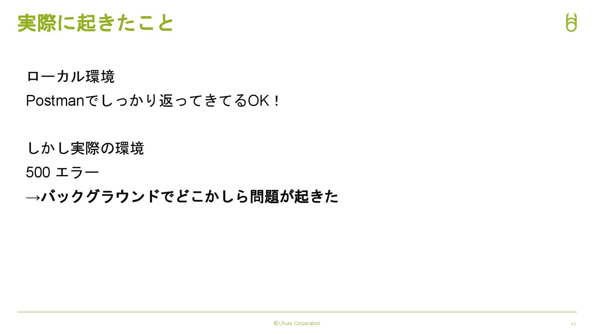 © Uhuru Corporation 11 実際に起きたこと ローカル環境 Postmanでしっかり返ってきてるOK! しかし実際の環境 500 エラー