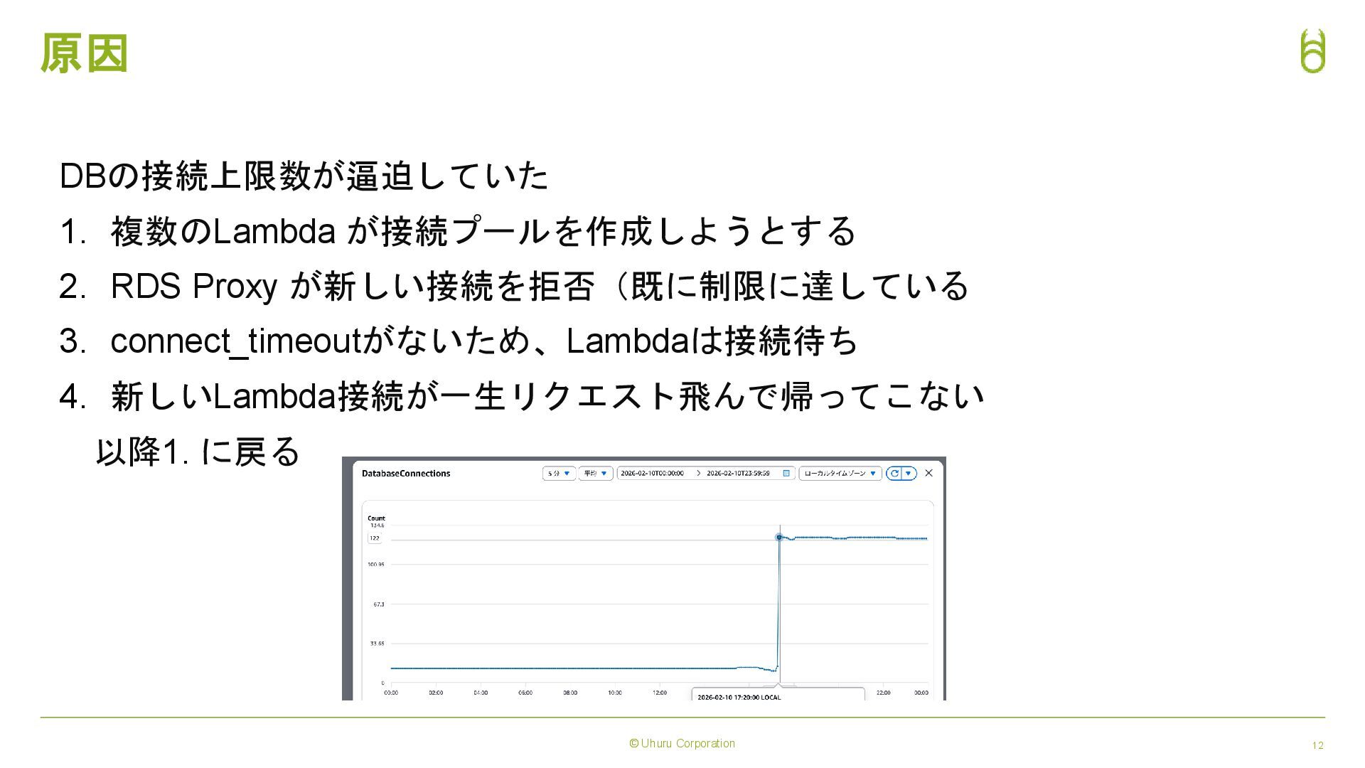 © Uhuru Corporation 12 原因 DBの接続上限数が逼迫していた 1. 複数のLambda が接続プールを作成しようとする 2.