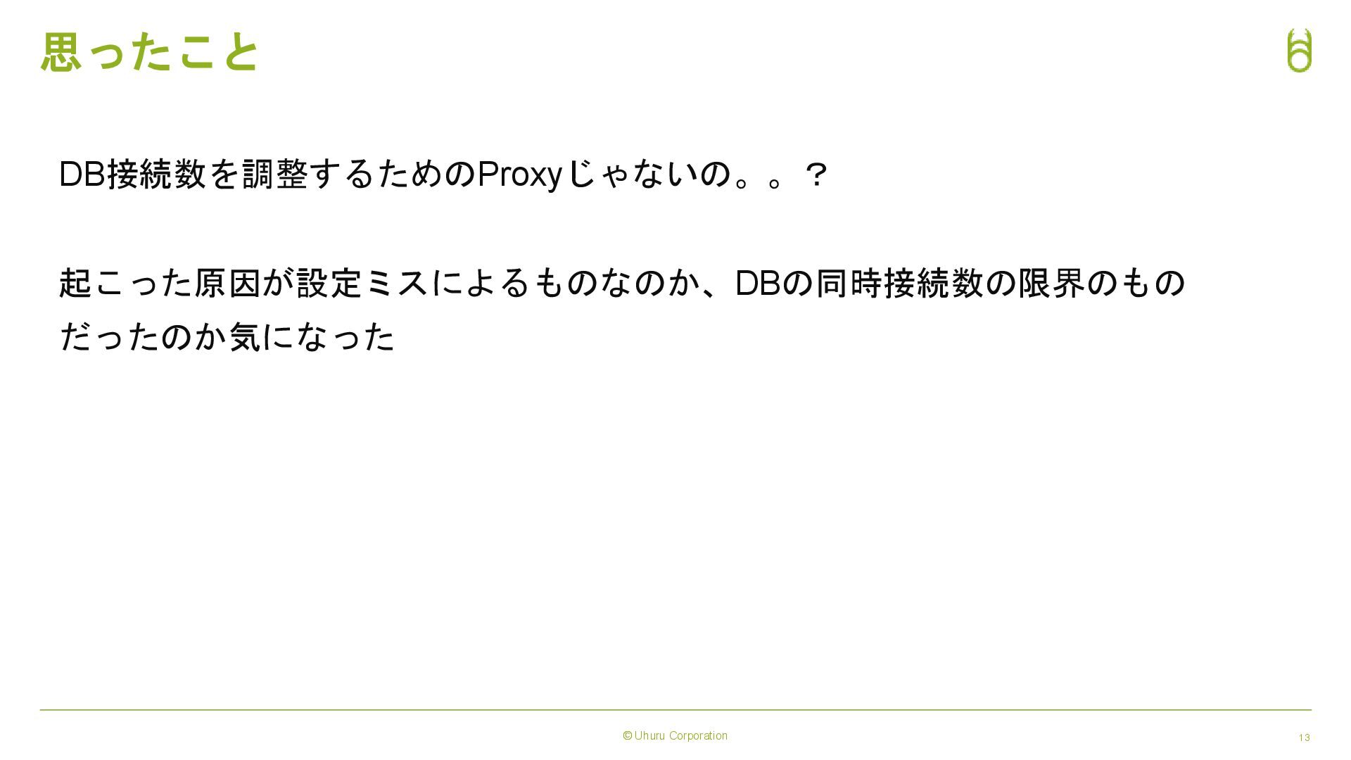 © Uhuru Corporation 13 思ったこと DB接続数を調整するためのProxyじゃないの。。? 起こった原因が設定ミスによるものなのか、DBの同時接続数の限界のもの だったのか気になった