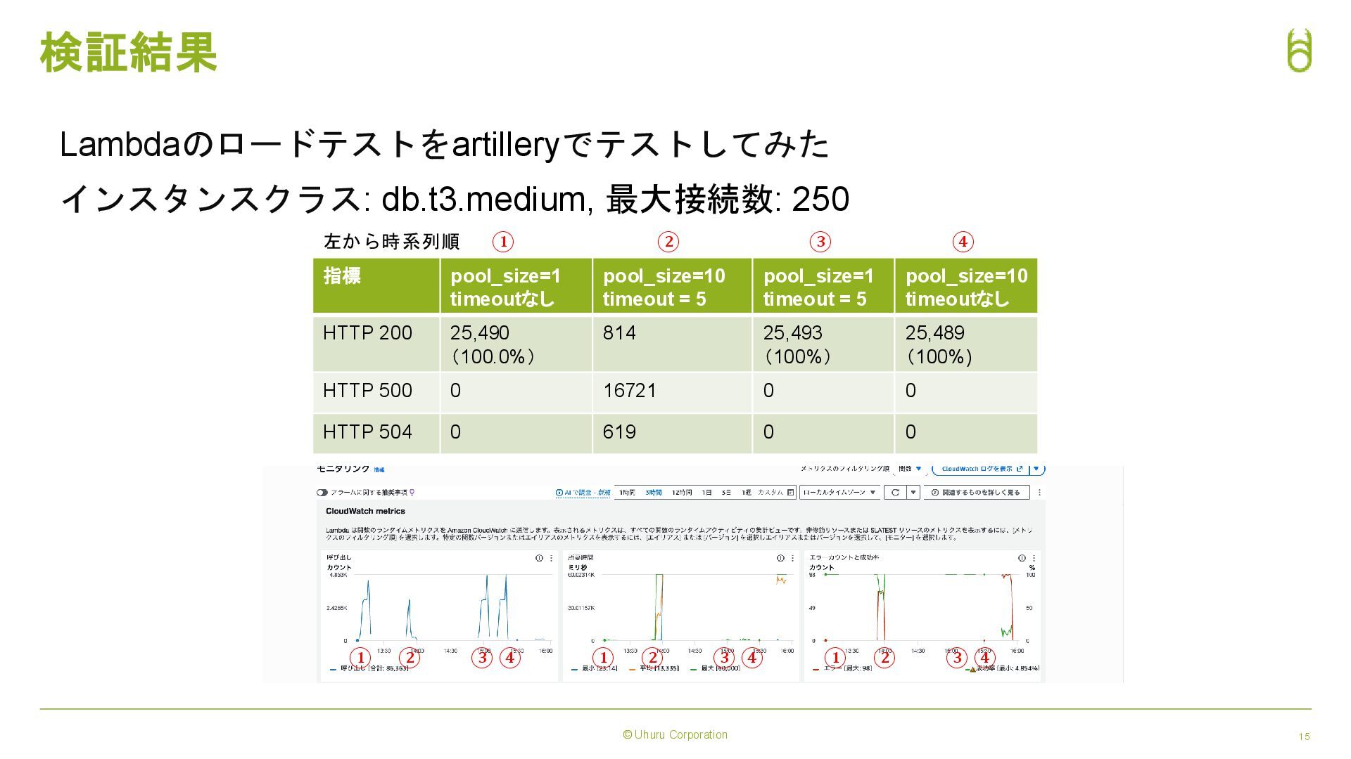 © Uhuru Corporation 15 検証結果 Lambdaのロードテストをartilleryでテストしてみた インスタンスクラス: db.t3.medium, 最大接続数: 250