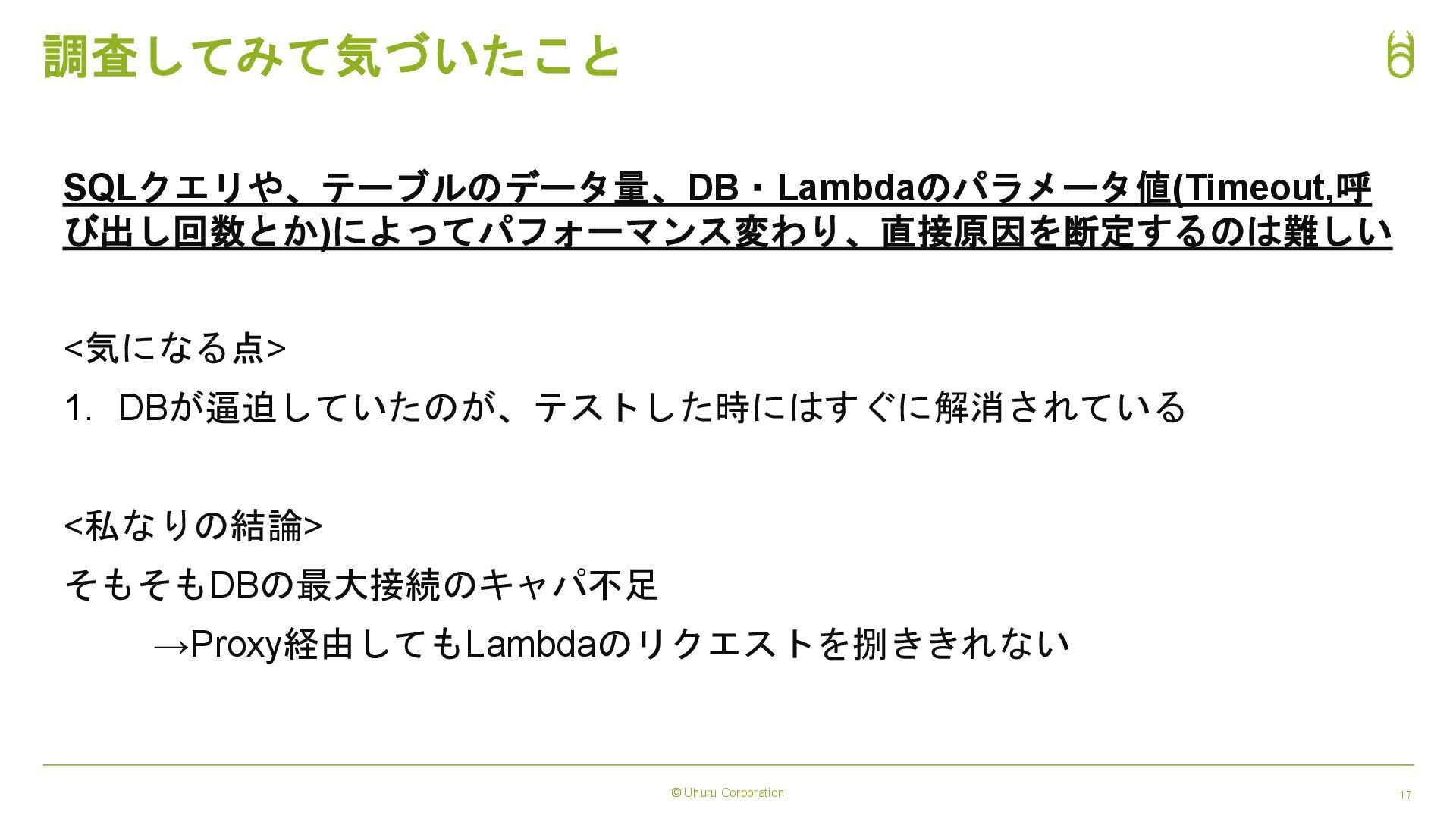 © Uhuru Corporation 17 調査してみて気づいたこと SQLクエリや、テーブルのデータ量、DB・Lambdaのパラメータ値(Timeout,呼 び出し回数とか)によってパフォーマンス変わり、直接原因を断定するのは難しい <気になる点> 1. DBが逼迫していたのが、テストした時にはすぐに解消されている