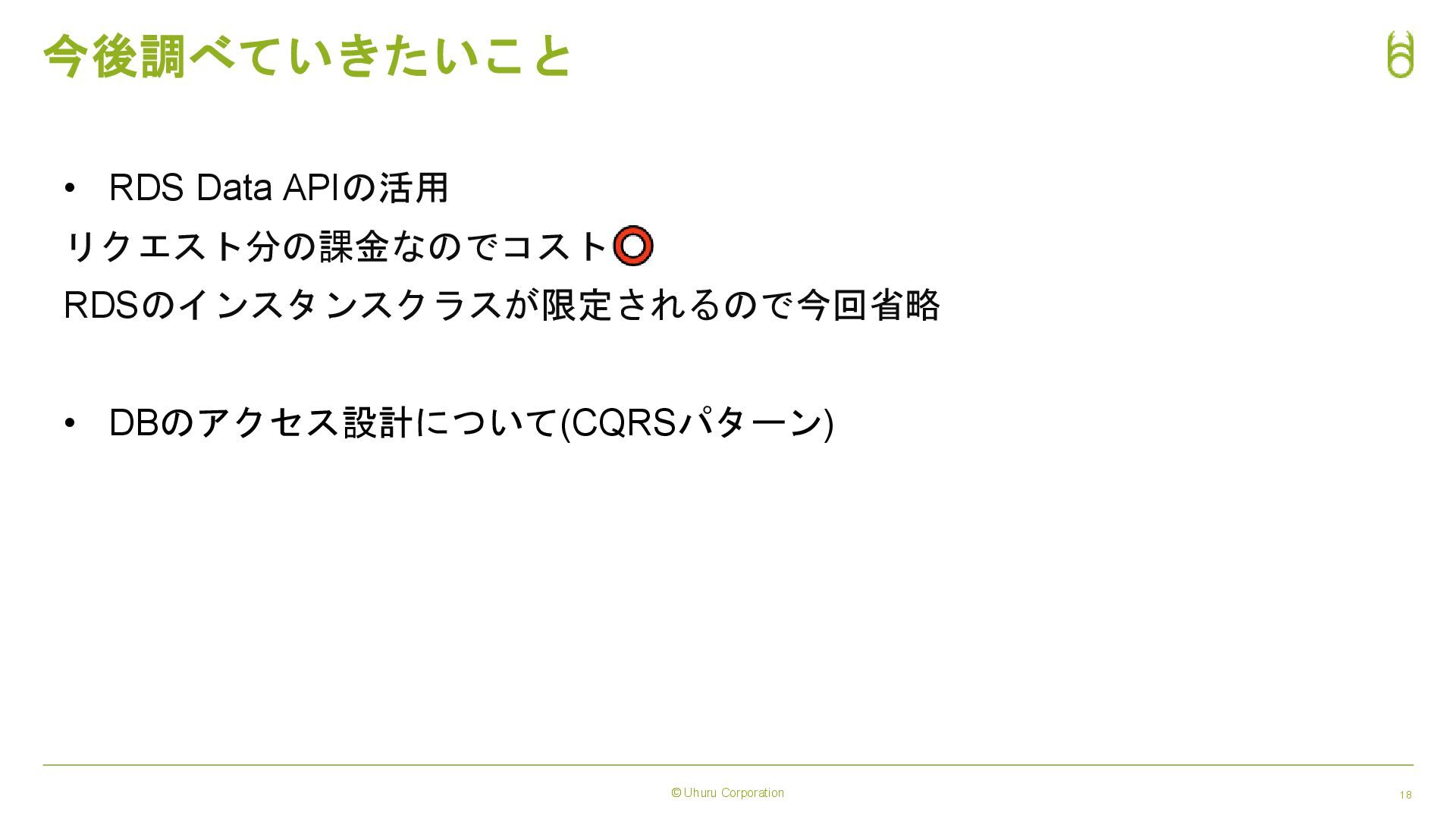 © Uhuru Corporation 18 今後調べていきたいこと • RDS Data APIの活用 リクエスト分の課金なのでコスト