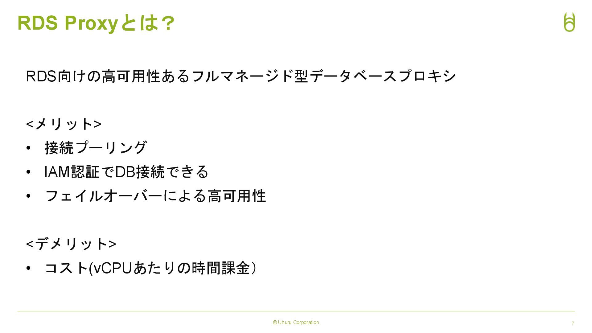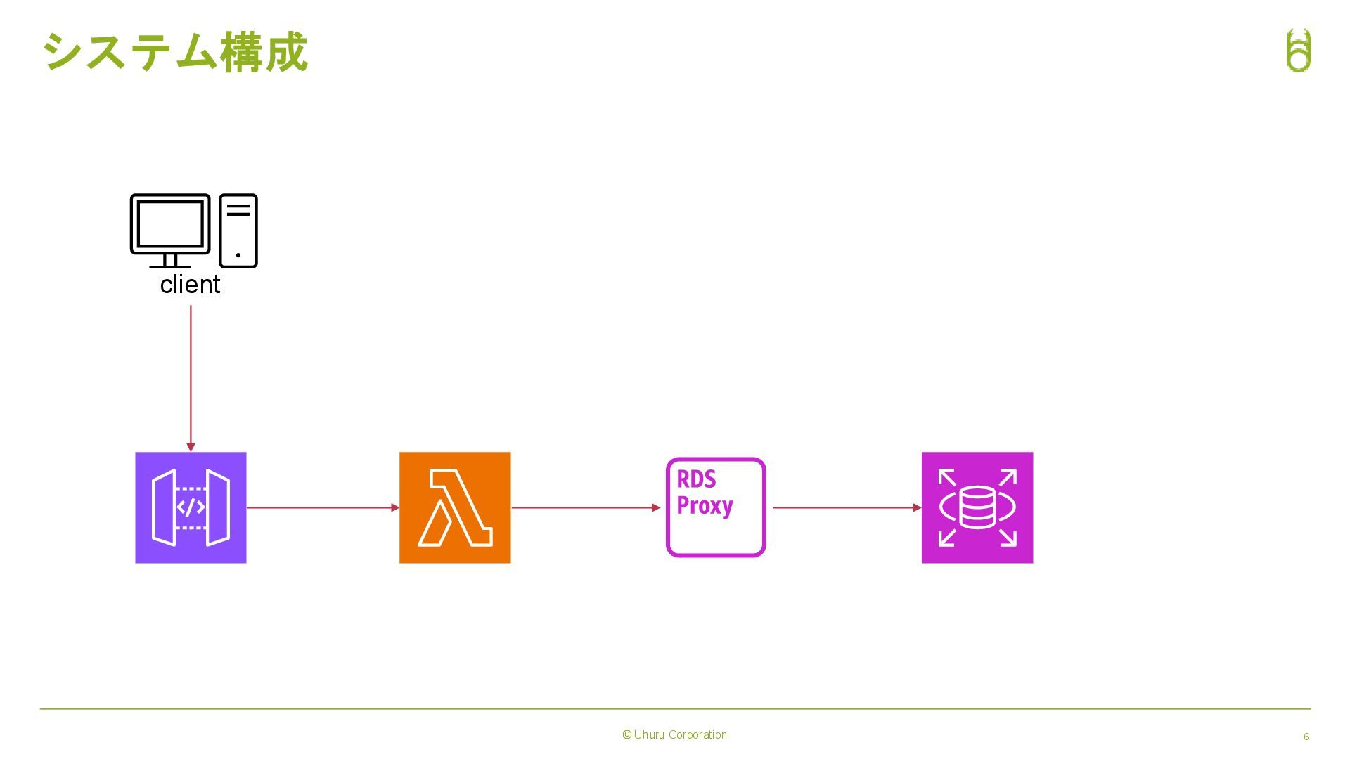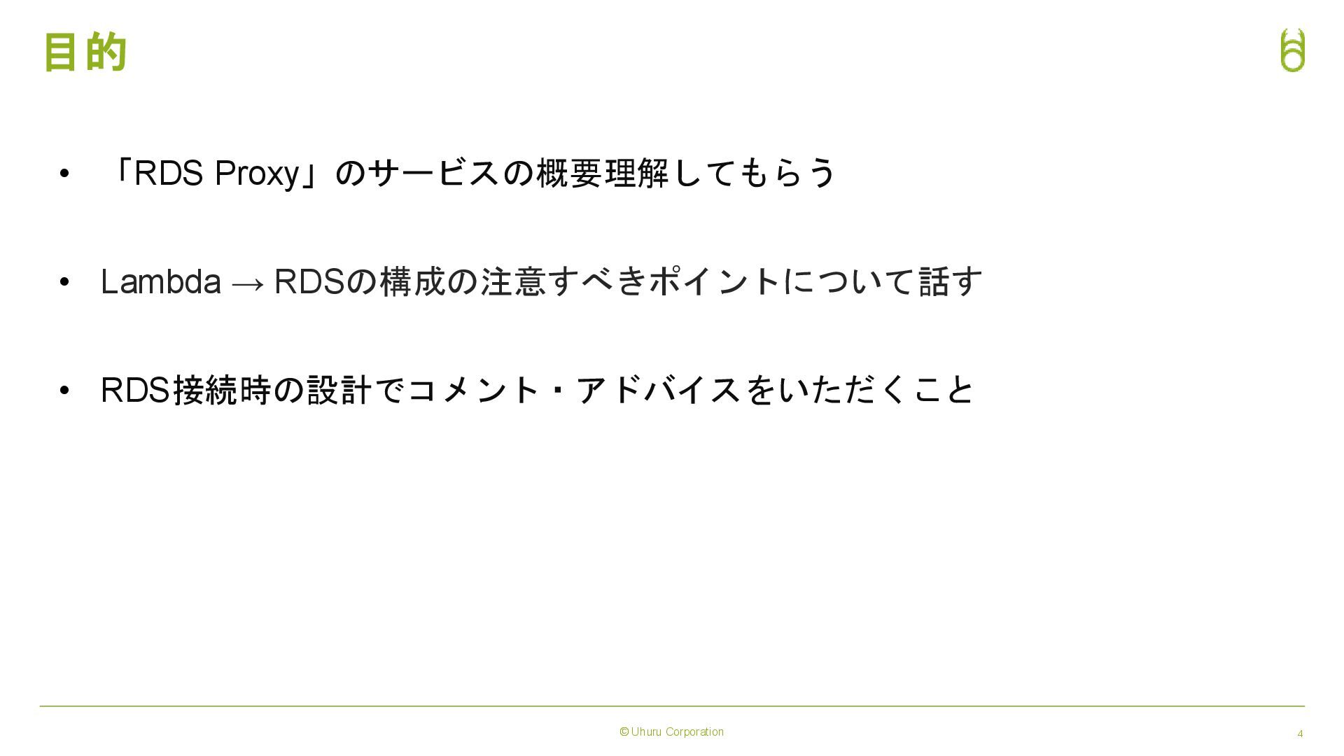© Uhuru Corporation 4 目的 • 「RDS Proxy」のサービスの概要理解してもらう • Lambda
