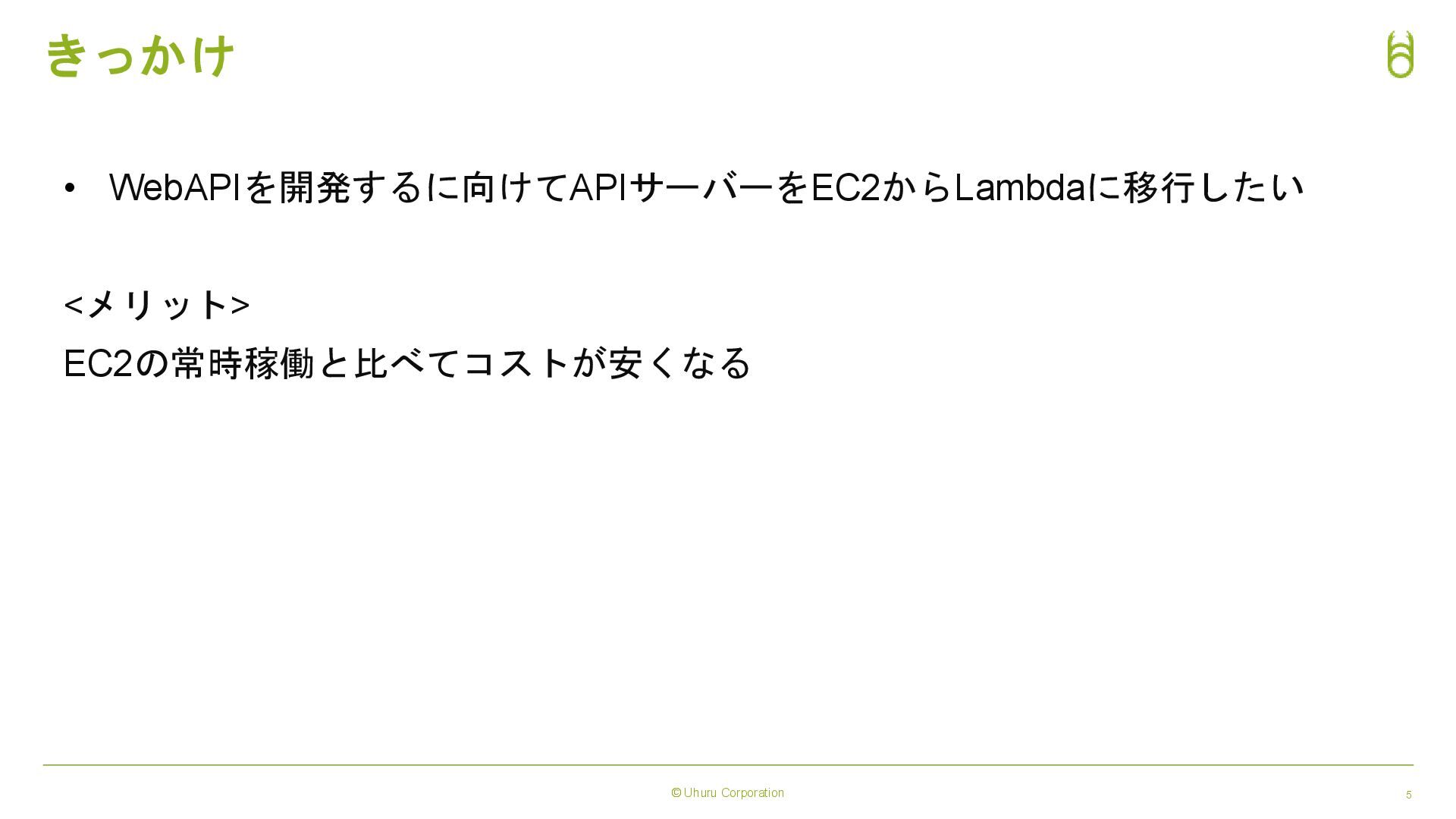 © Uhuru Corporation 5 きっかけ • WebAPIを開発するに向けてAPIサーバーをEC2からLambdaに移行したい <メリット> EC2の常時稼働と比べてコストが安くなる