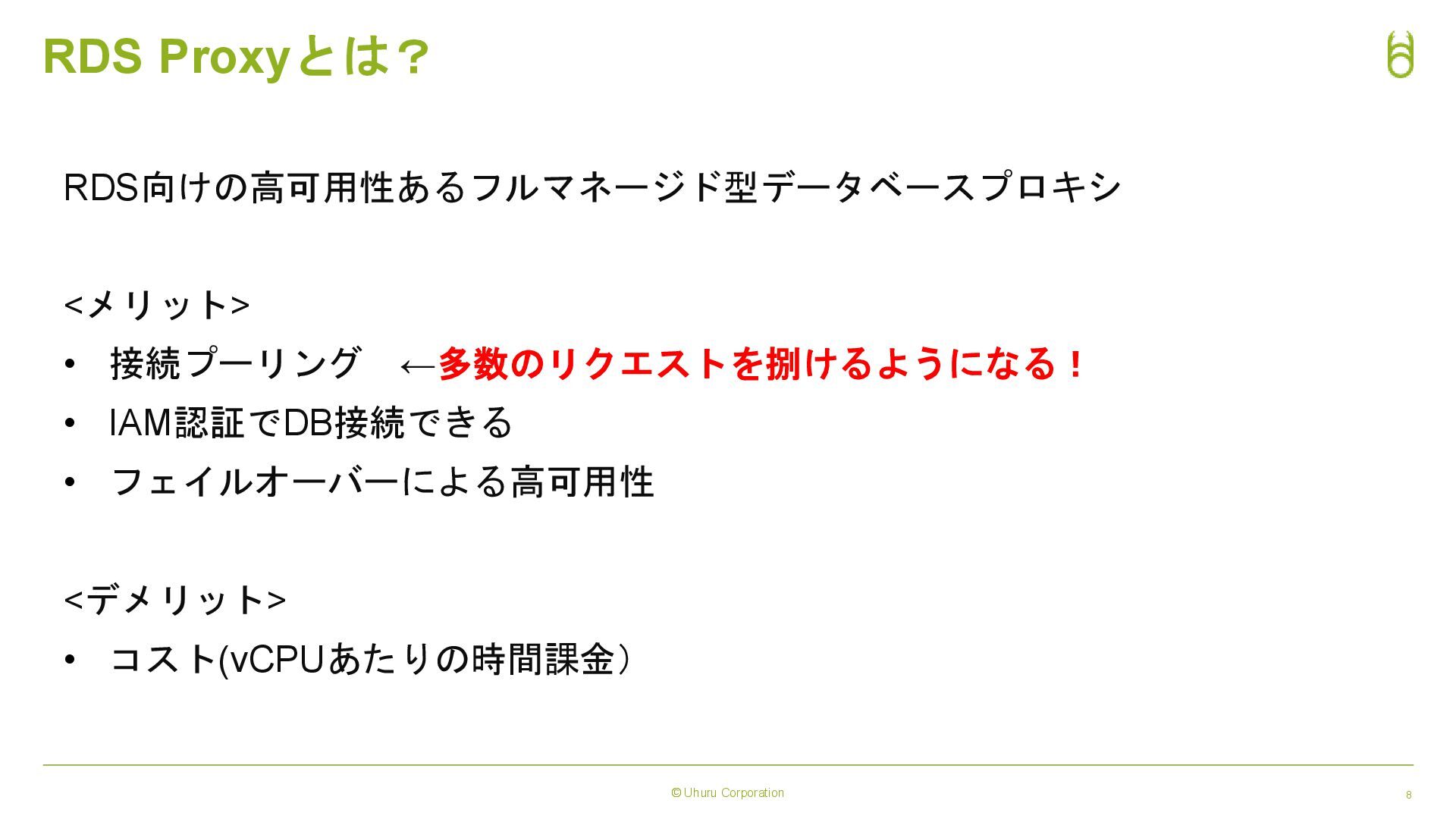 © Uhuru Corporation 7 RDS Proxyとは? RDS向けの高可用性あるフルマネージド型データベースプロキシ <メリット> • 接続プーリング