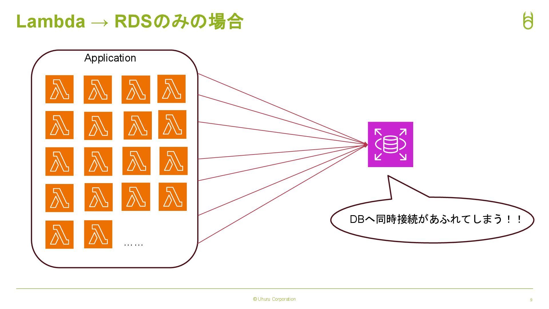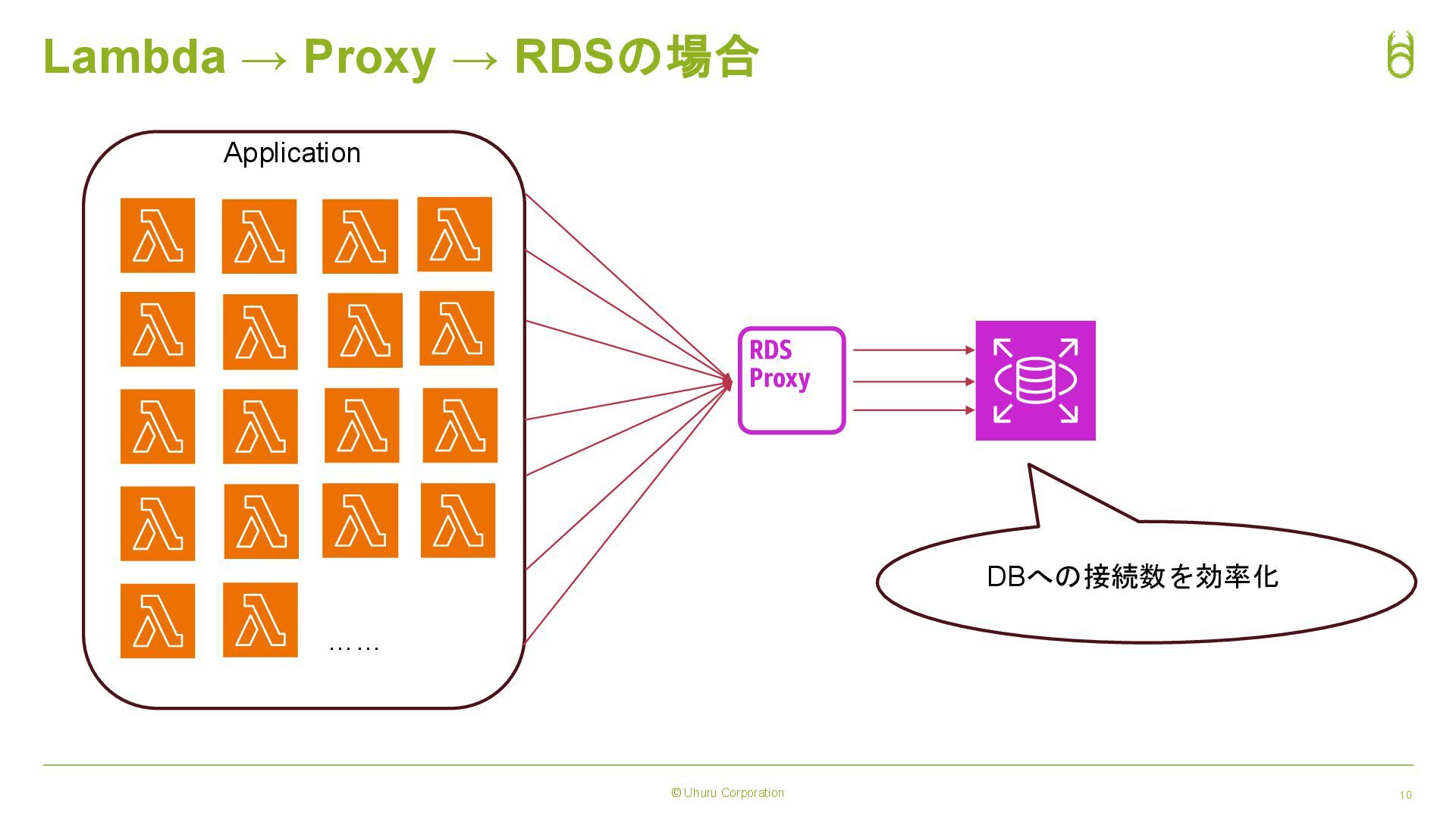 © Uhuru Corporation 9 Lambda → RDSのみの場合 Application …… DBへ同時接続があふれてしまう!!