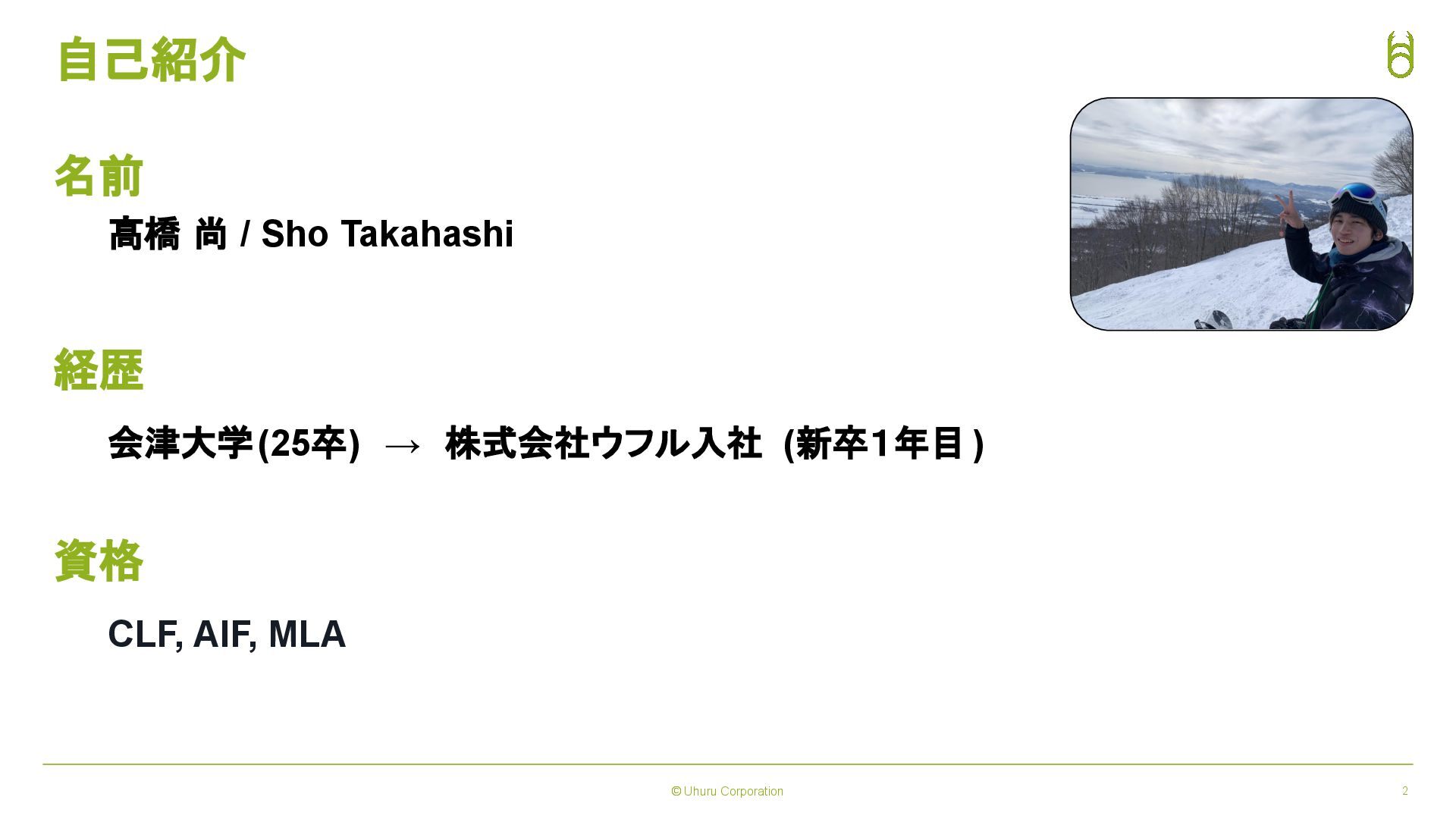 会津大学(25卒) → 株式会社ウフル入社 (新卒1年目 ) 資格 CLF, AIF, MLA 2 自己紹介