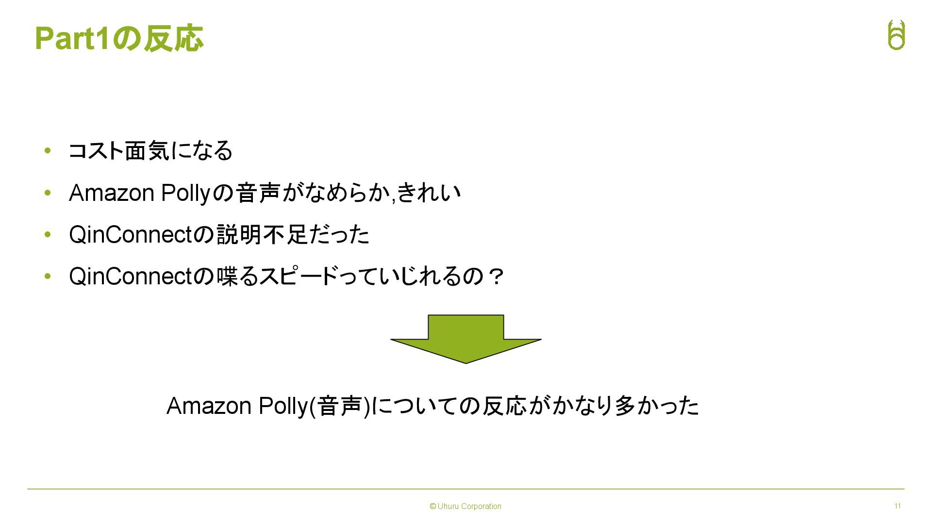 © Uhuru Corporation • コスト面気になる • Amazon Pollyの音声がなめらか,きれい • QinConnectの説明不足だった