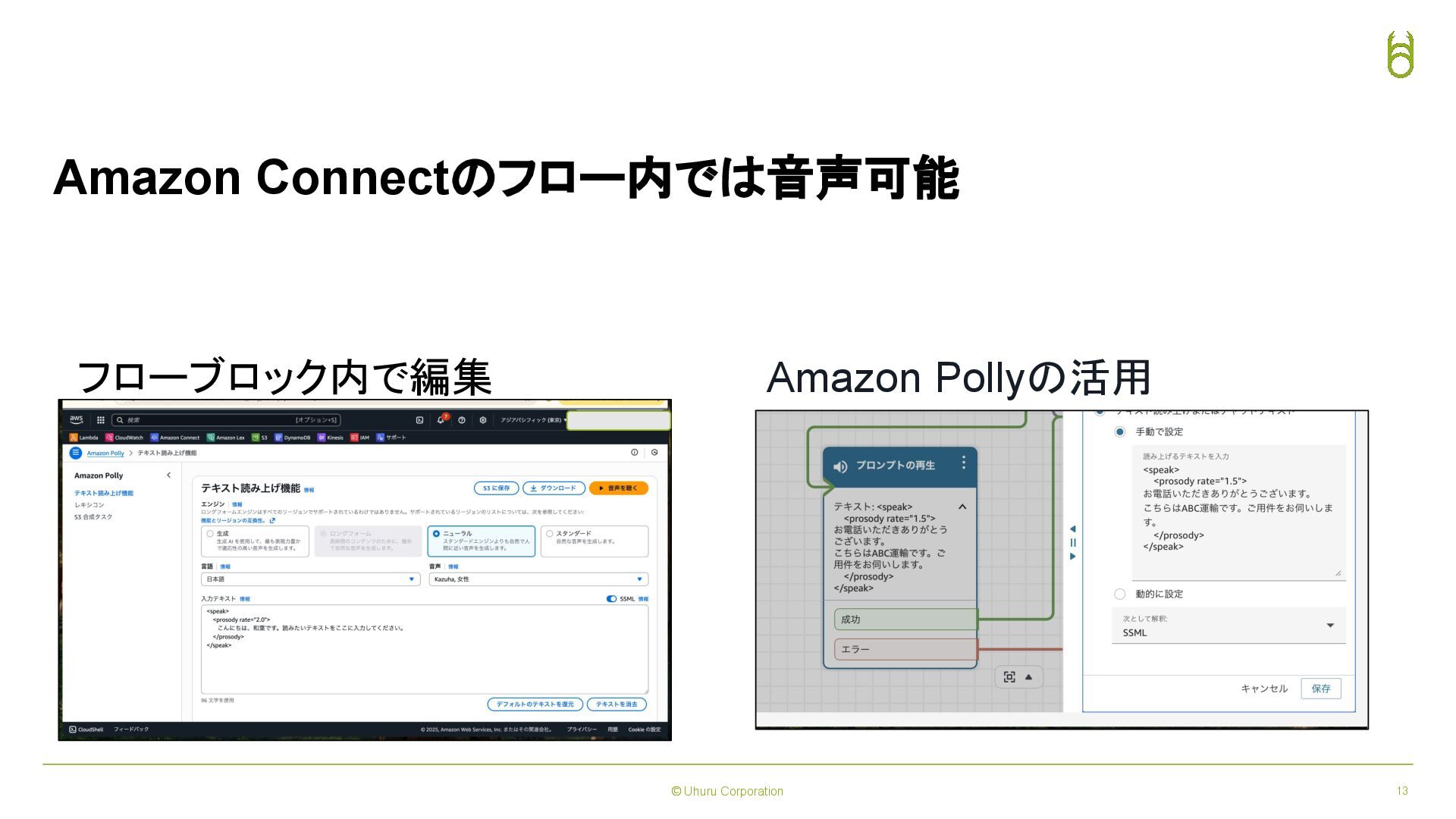 © Uhuru Corporation Amazon Connectのフロー内では音声可能 13 Amazon Pollyの活用 フローブロック内で編集