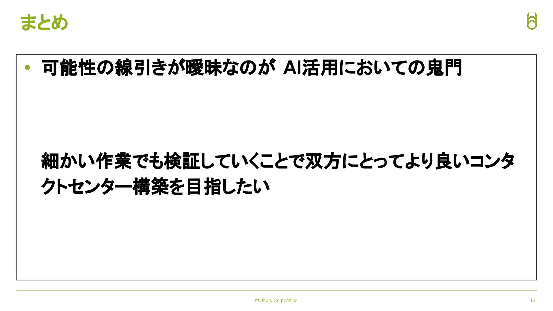 © Uhuru Corporation • 可能性の線引きが曖昧なのが AI活用においての鬼門 細かい作業でも検証していくことで双方にとってより良いコンタ クトセンター構築を目指したい 16 まとめ