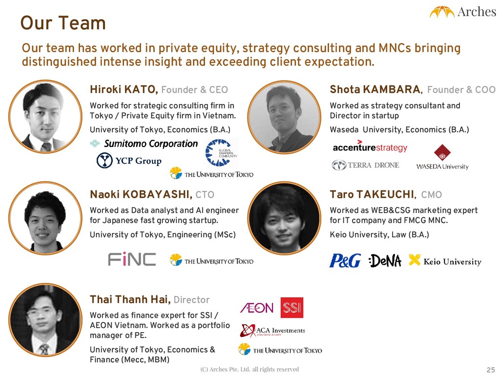 Team Our team has worked in private equity, strategy consulting and MNCs bringing distinguished intense insight and exceeding client expectation. Hiroki KATO, Founder & CEO Worked for strategic consulting firm in Tokyo / Private Equity firm in Vietnam. University of Tokyo, Economics (B.A.) Shota KAMBARA, Founder & COO Worked as strategy consultant and Director in startup Waseda University, Economics (B.A.) Naoki KOBAYASHI, CTO Worked as Data analyst and AI engineer for Japanese fast growing startup. University of Tokyo, Engineering (MSc) Taro TAKEUCHI, CMO Worked as WEB&CSG marketing expert for IT company and FMCG MNC. Keio University, Law (B.A.) Thai Thanh Hai, Director Worked as finance expert for SSI / AEON Vietnam. Worked as a portfolio manager of PE. University of Tokyo, Economics & Finance (Mecc, MBM)