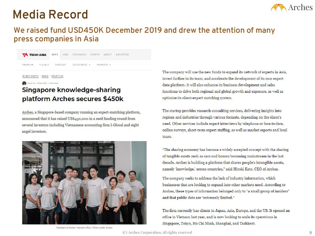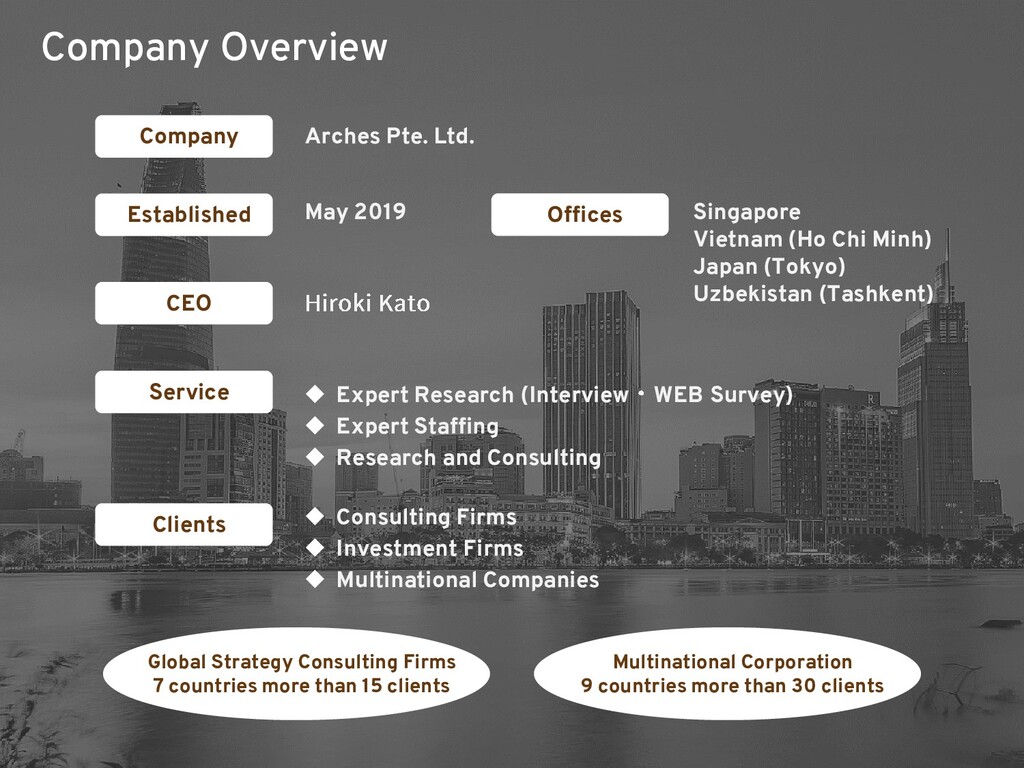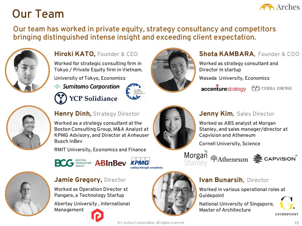 Our team has worked in private equity, strategy consultancy and competitors bringing distinguished intense insight and exceeding client expectation. Hiroki KATO, Founder & CEO Worked for strategic consulting firm in Tokyo / Private Equity firm in Vietnam. University of Tokyo, Economics Shota KAMBARA, Founder & COO Worked as strategy consultant and Director in startup Waseda University, Economics Henry Dinh, Strategy Director Worked as a strategy consultant at the Boston Consulting Group, M&A Analyst at KPMG Advisory, and Director at Anheuser Busch InBev RMIT University, Economics and Finance Jenny Kim, Sales Director Worked as ABS analyst at Morgan Stanley, and sales manager/director at Capvision and Atheneum Cornell University, Science Jamie Gregory, Director Worked as Operation Director st Pangara, a Technology Startup Abertay University , International Management Ivan Bunarsih, Director Worked in various operational roles at Guidepoint National University of Singapore, Master of Architecture