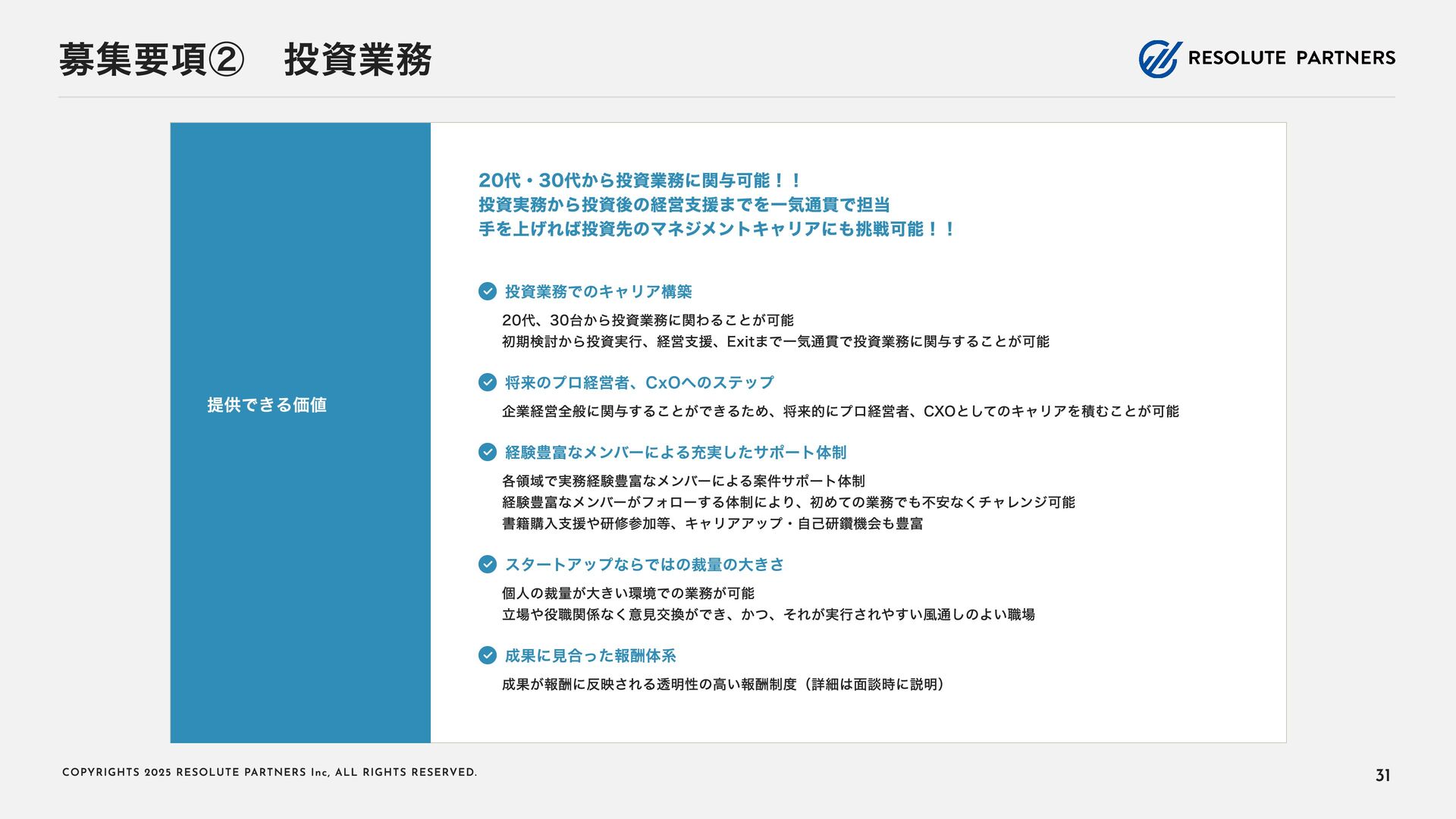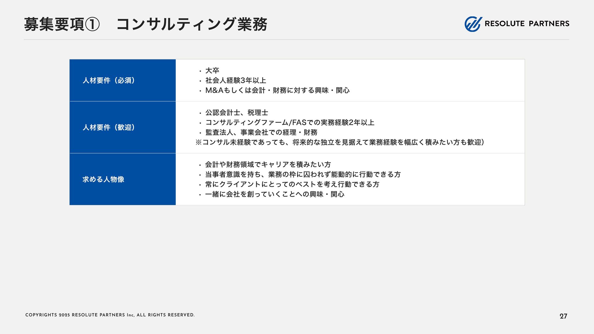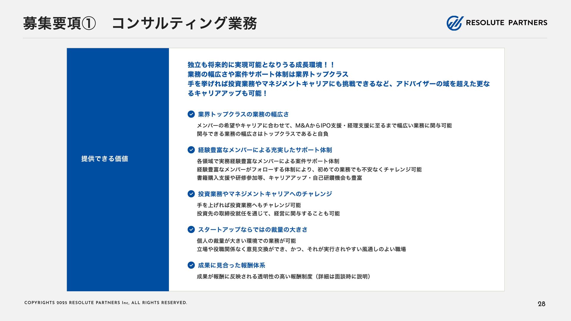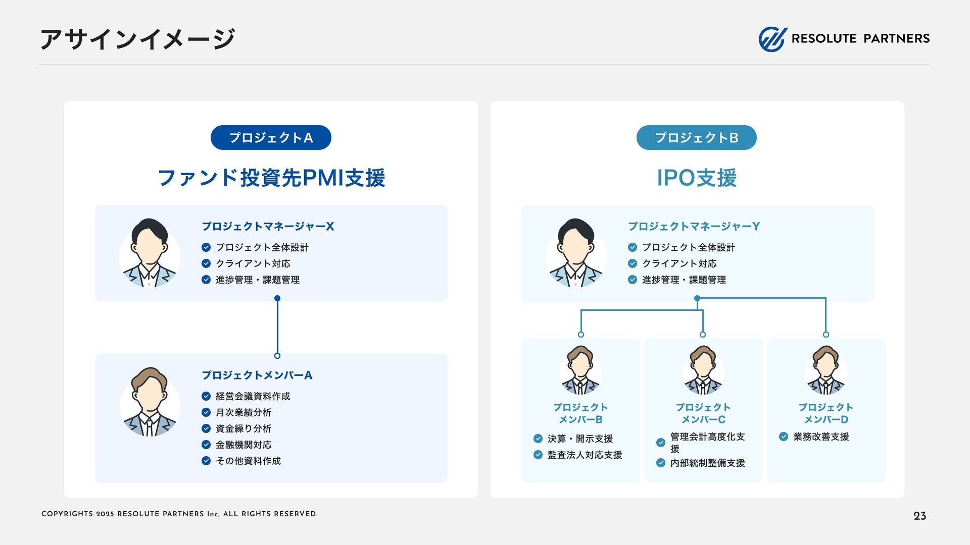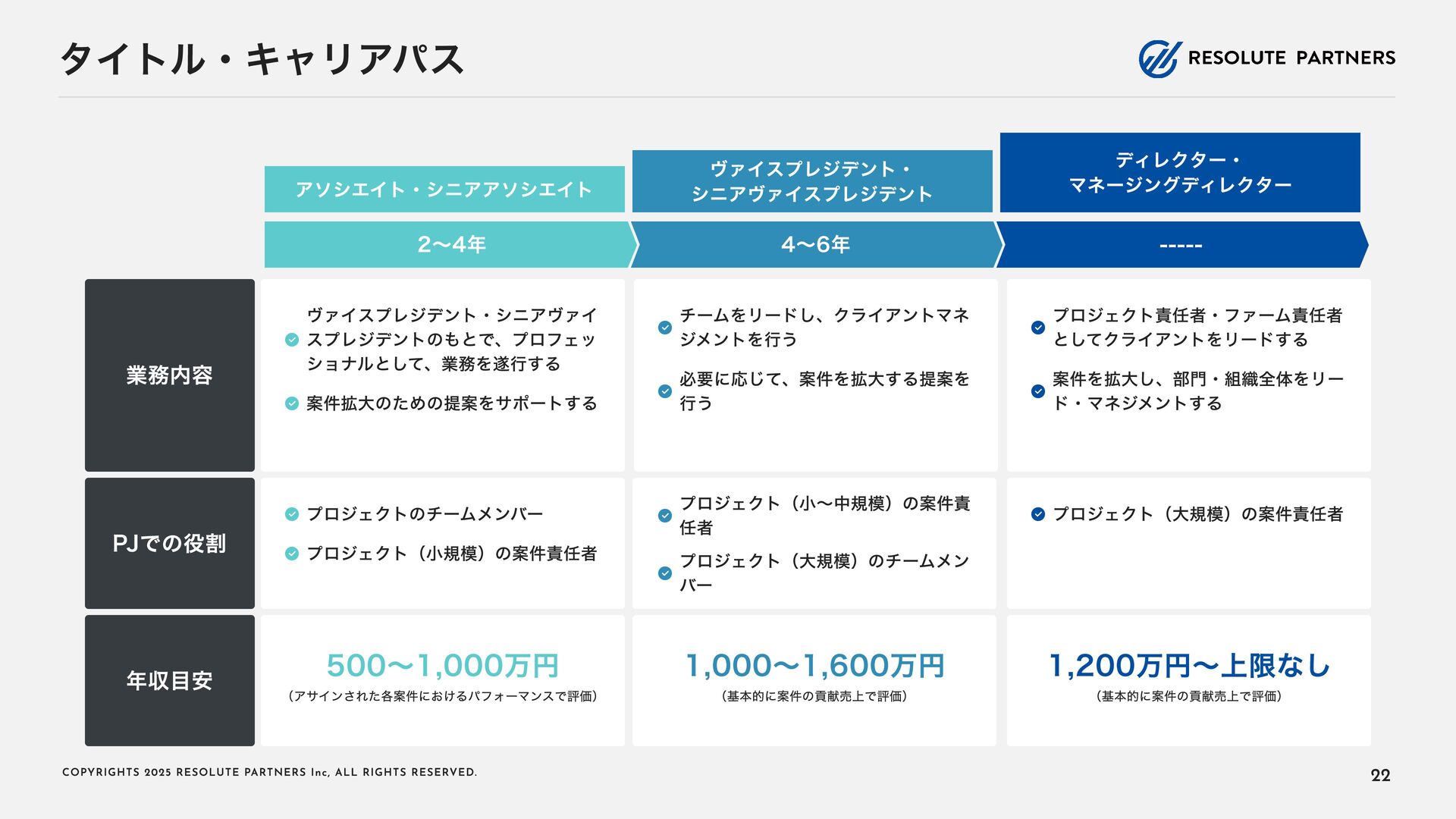 2 0 2 5 R E S O L U T E PA R T N E R S I n c , A L L R I G H T S R E S E RV E D . タイトル・キャリアパス アソシエイト・シニアアソシエイト ヴァイスプレジデント・ シニアヴァイスプレジデント ディレクター・ マネージングディレクター 2〜4年 4〜6年 ----- ヴァイスプレジデント・シニアヴァイ スプレジデントのもとで、プロフェッ ショナルとして、業務を遂行する 案件拡大のための提案をサポートする チームをリードし、クライアントマネ ジメントを行う 必要に応じて、案件を拡大する提案を 行う プロジェクト責任者・ファーム責任者 としてクライアントをリードする 案件を拡大し、部門・組織全体をリー ド・マネジメントする プロジェクトのチームメンバー プロジェクト(小規模)の案件責任者 プロジェクト(小 ~中 規模)の案件責 任者 プロジェクト(大規模)のチームメン バー プロジェクト(大規模)の案件責任者 業務内容 PJでの役割 年 収目安 500~1,000万円 (アサインされた各案件におけるパフォーマンスで評価) 1,000~1, 6 00万円 (基本的に案件の貢献売上で評価) 1, 2 00万円~上限なし (基本的に案件の貢献売上で評価) 22