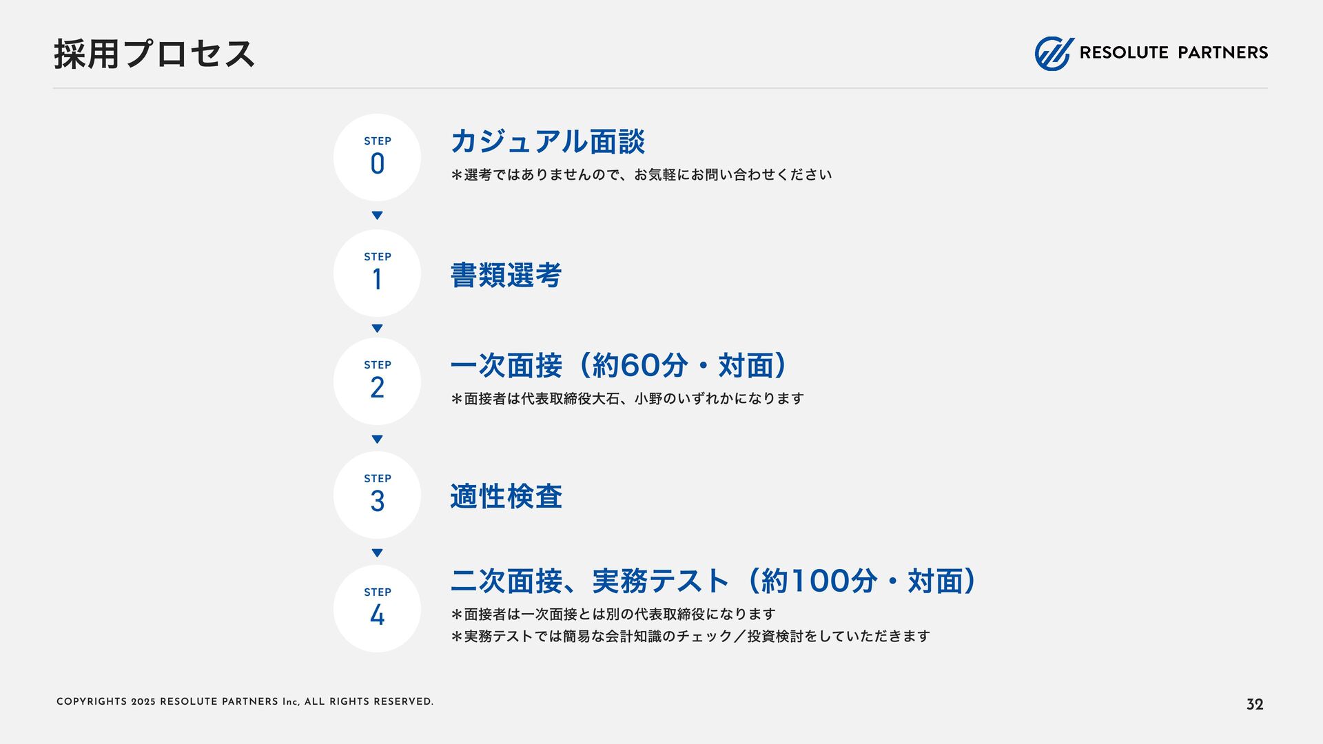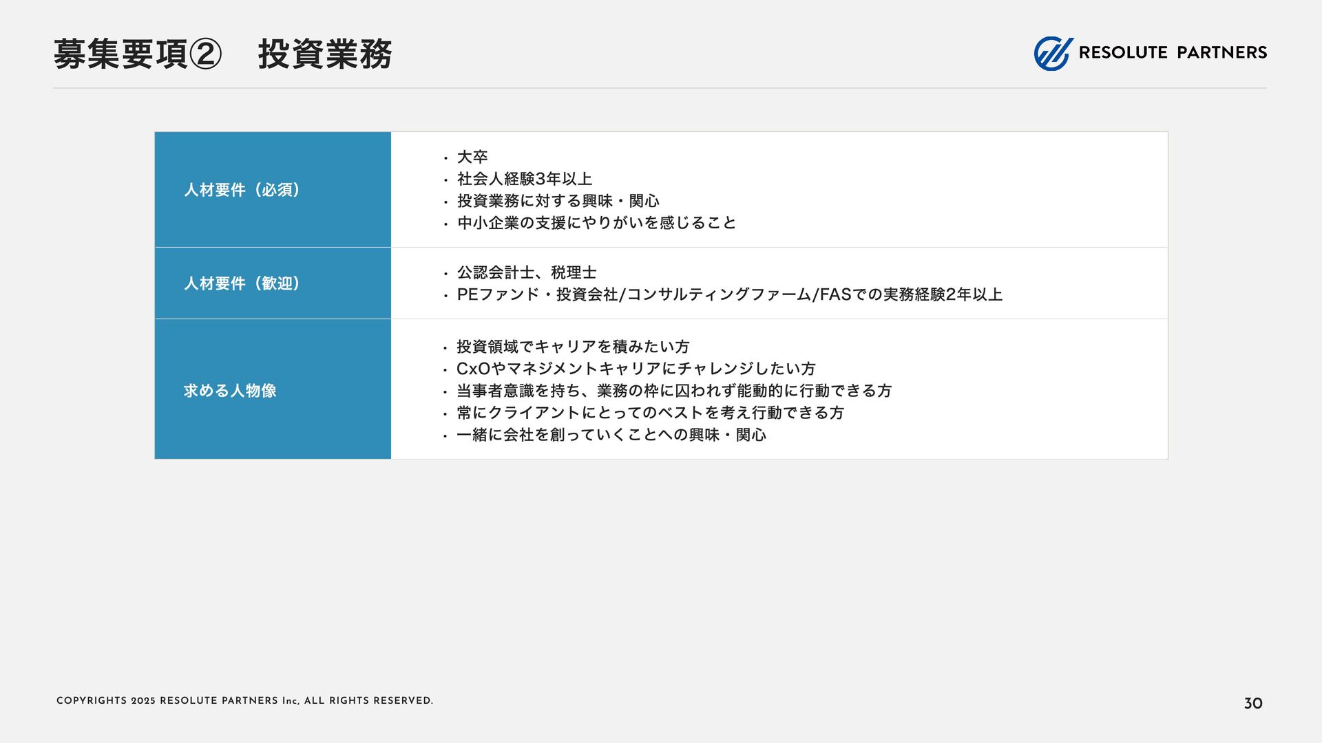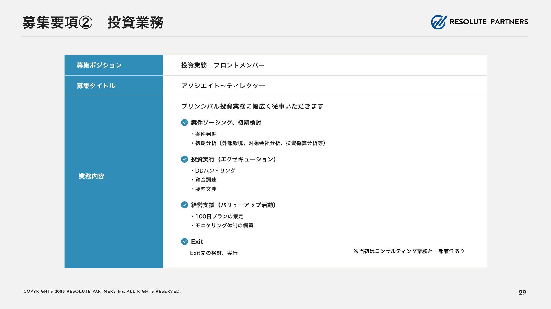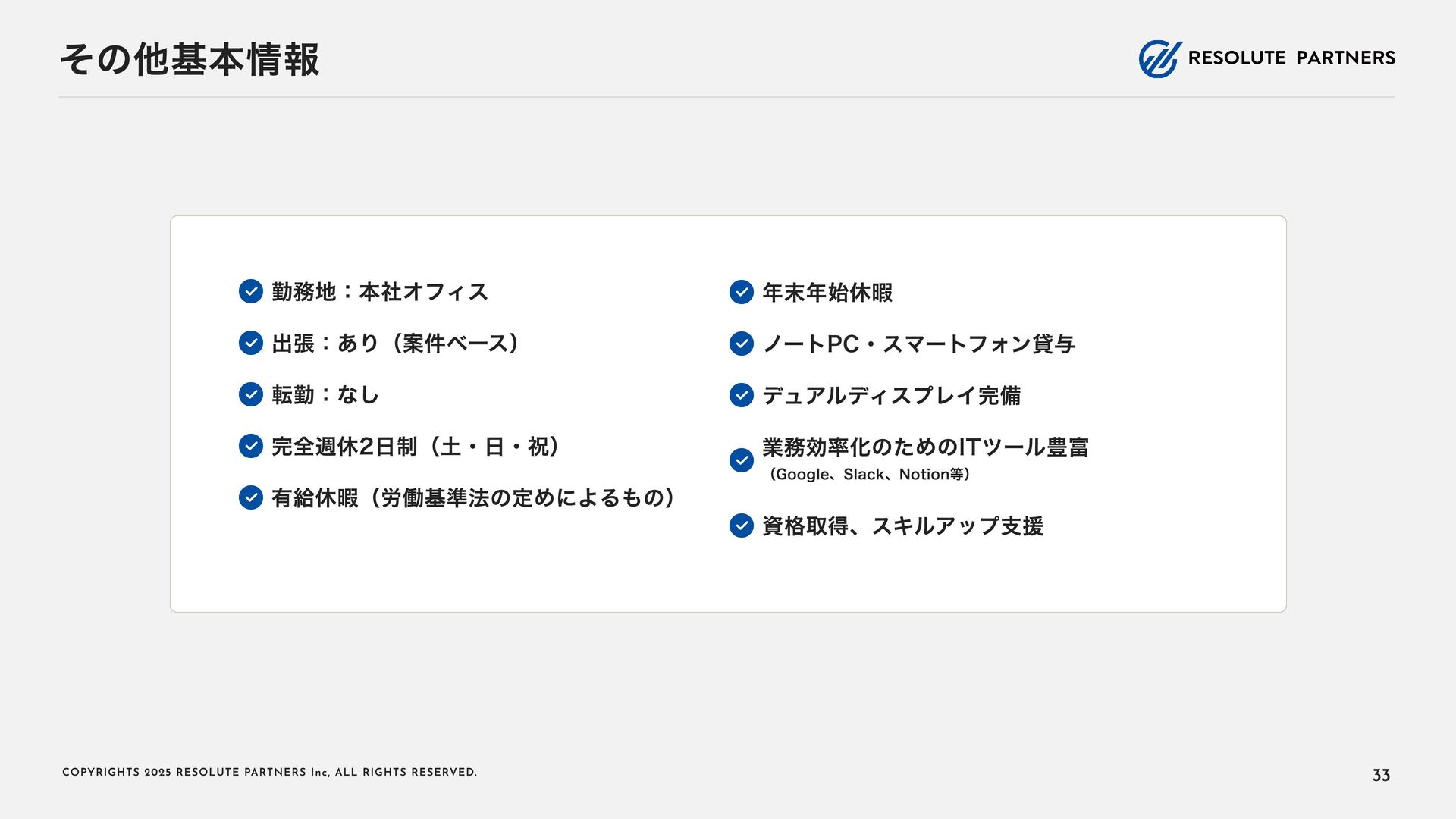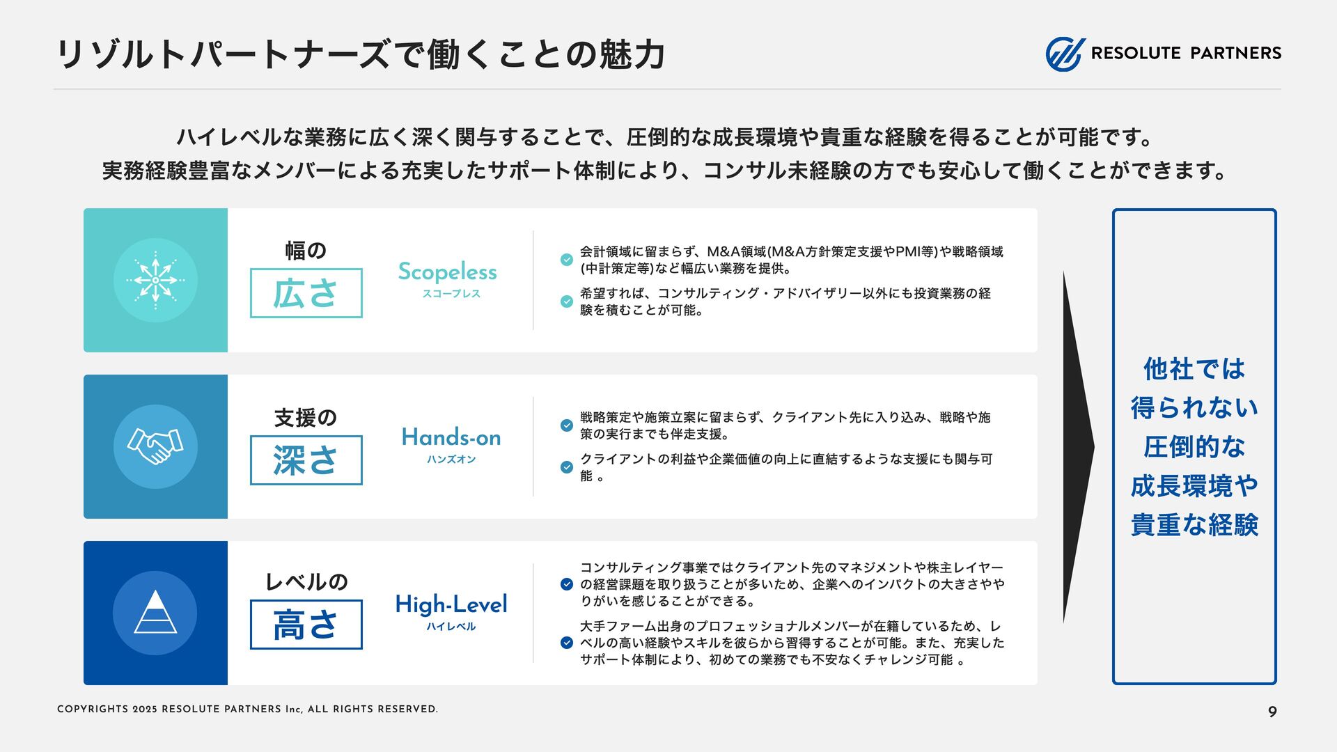 2 0 2 5 R E S O L U T E PA R T N E R S I n c , A L L R I G H T S R E S E RV E D . タイトル・キャリアパス アソシエイト・シニアアソシエイト ヴァイスプレジデント・ シニアヴァイスプレジデント ディレクター・ マネージングディレクター 2〜4年 4〜6年 ----- ヴァイスプレジデント・シニアヴァイ スプレジデントのもとで、プロフェッ ショナルとして、業務を遂行する 案件拡大のための提案をサポートする チームをリードし、クライアントマネ ジメントを行う 必要に応じて、案件を拡大する提案を 行う プロジェクト責任者・ファーム責任者 としてクライアントをリードする 案件を拡大し、部門・組織全体をリー ド・マネジメントする プロジェクトのチームメンバー プロジェクト(小規模)の案件責任者 プロジェクト(小 ~中 規模)の案件責 任者 プロジェクト(大規模)のチームメン バー プロジェクト(大規模)の案件責任者 業務内容 PJでの役割 年 収目安 500~1,000万円 (アサインされた各案件におけるパフォーマンスで評価) 1,000~1, 6 00万円 (基本的に案件の貢献売上で評価) 1, 2 00万円~上限なし (基本的に案件の貢献売上で評価) 22