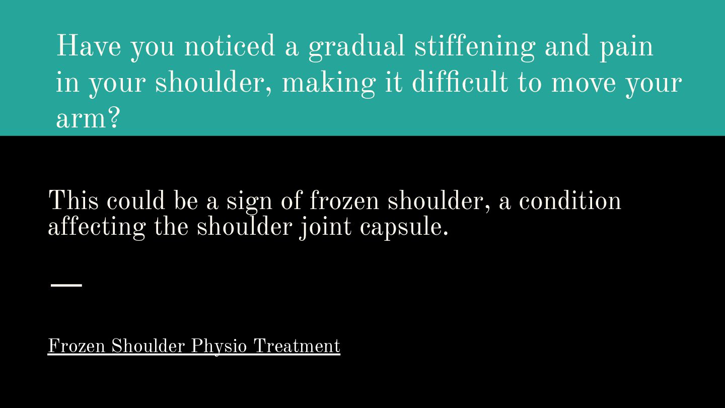 shoulder, making it difficult to move your arm? This could be a sign of frozen shoulder, a condition affecting the shoulder joint capsule. Frozen Shoulder Physio Treatment