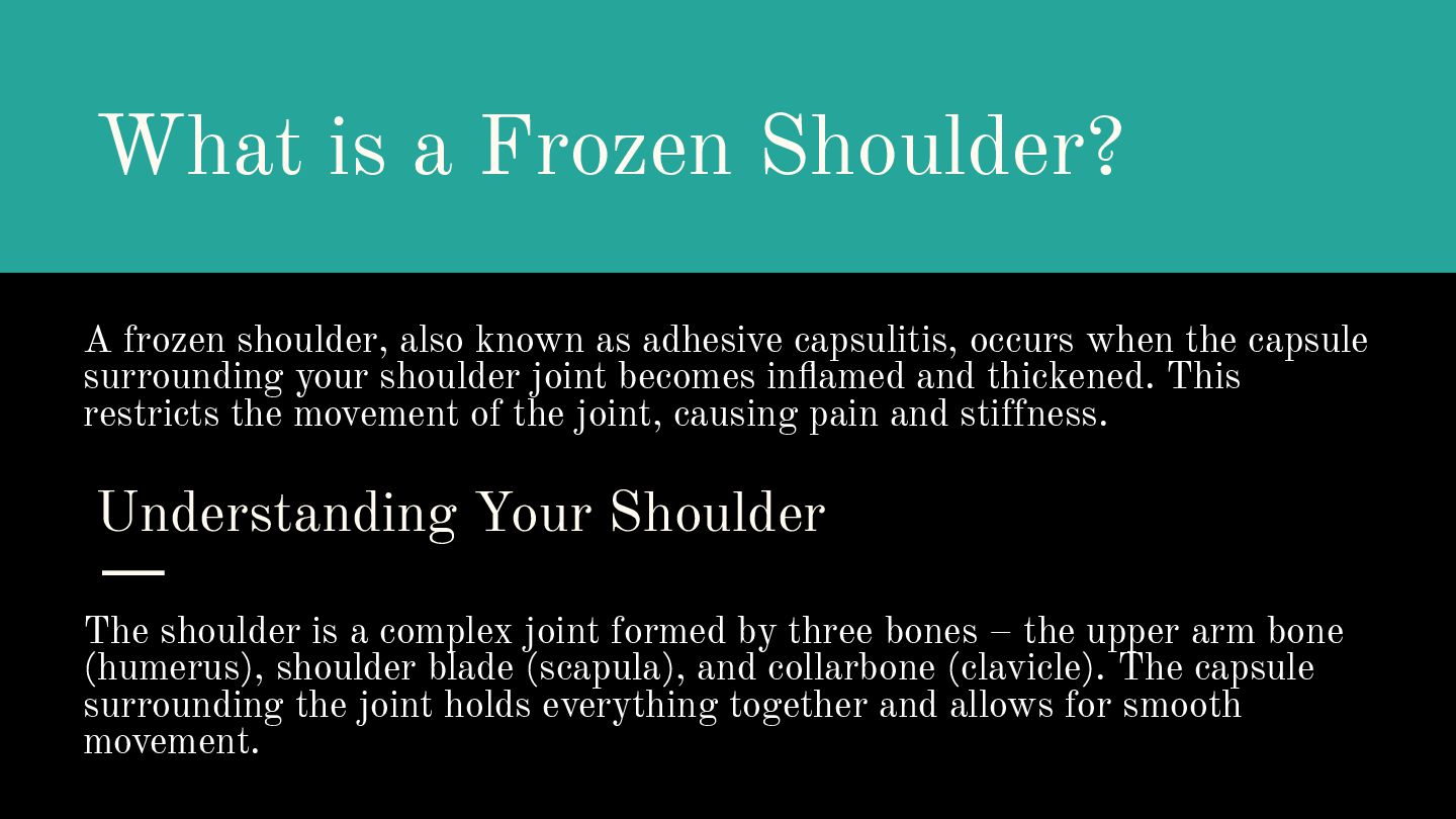 as adhesive capsulitis, occurs when the capsule surrounding your shoulder joint becomes inflamed and thickened. This restricts the movement of the joint, causing pain and stiffness. Understanding Your Shoulder The shoulder is a complex joint formed by three bones – the upper arm bone (humerus), shoulder blade (scapula), and collarbone (clavicle). The capsule surrounding the joint holds everything together and allows for smooth movement.