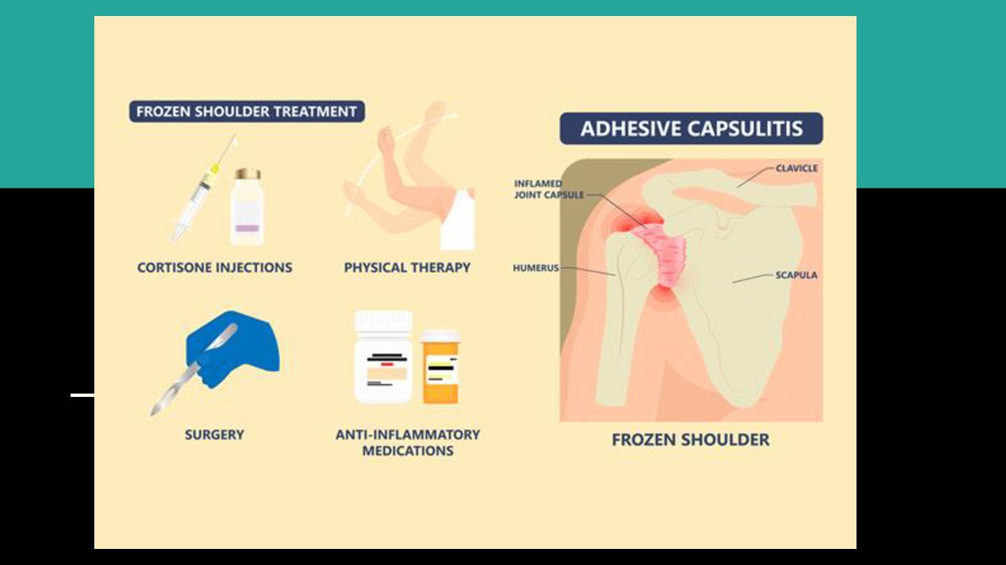 frozen shoulder is to manage pain and regain shoulder movement. Your doctor may recommend: • Anti-inflammatory medications (NSAIDs): To reduce pain and inflammation. • Physical therapy: Gentle stretching and strengthening exercises to improve mobility. • Corticosteroid injections: To reduce inflammation directly within the joint. • Hydrodilatation: Injecting sterile fluid into the capsule to stretch it and facilitate movement. • Manipulation under anesthesia: Involves controlled stretching of the capsule while under anesthesia. • Arthroscopic surgery: A minimally invasive procedure to remove scar tissue and improve flexibility.