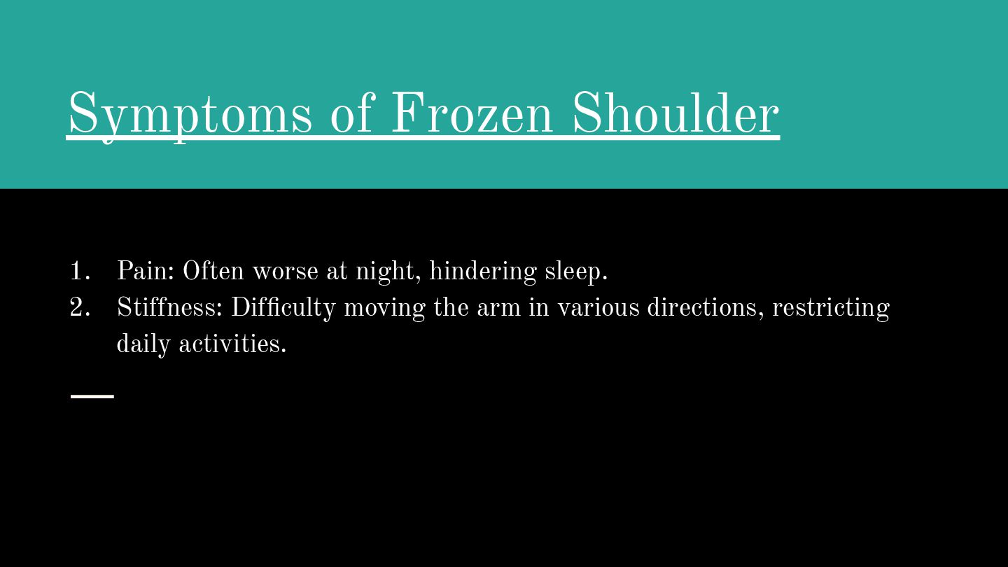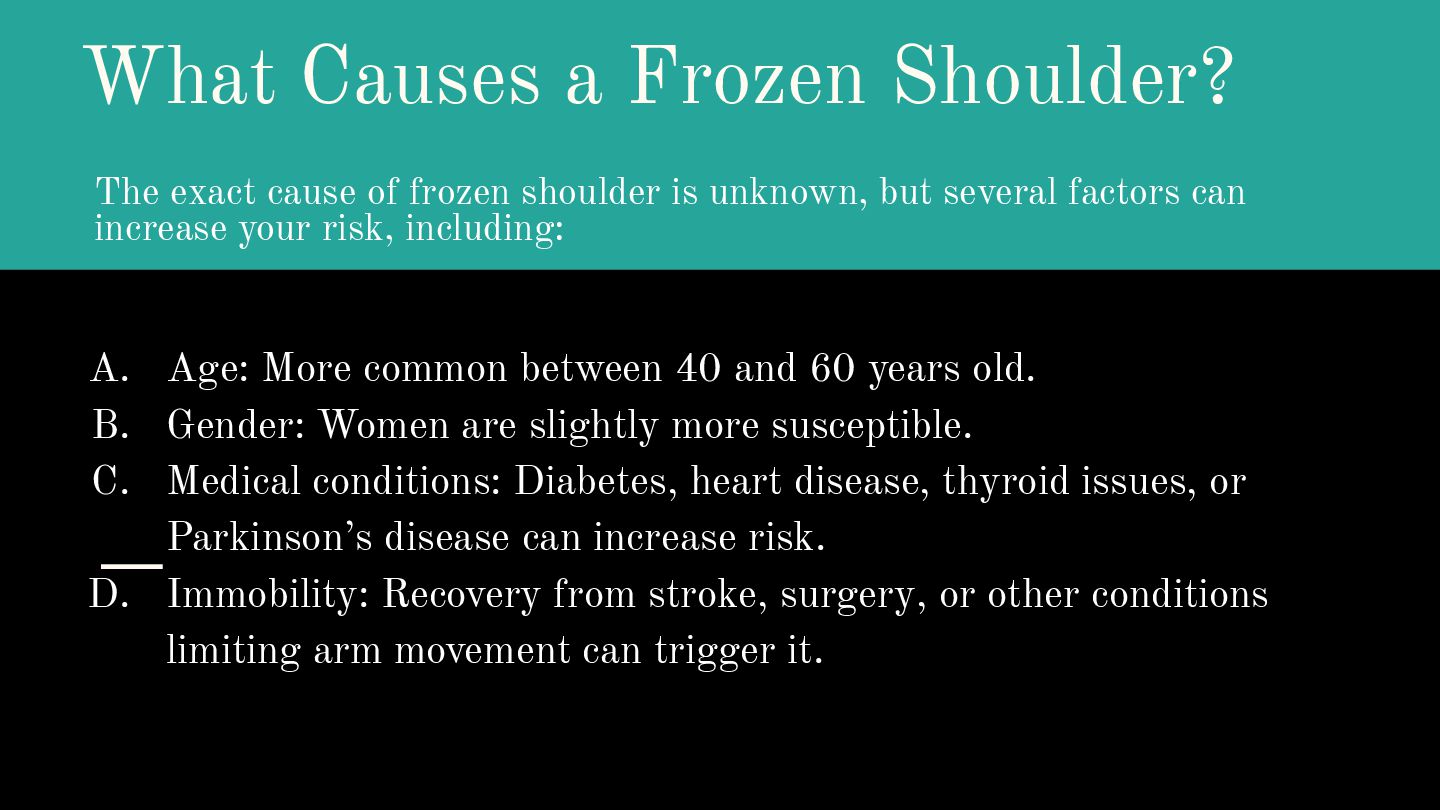 shoulder is unknown, but several factors can increase your risk, including: A. Age: More common between 40 and 60 years old. B. Gender: Women are slightly more susceptible. C. Medical conditions: Diabetes, heart disease, thyroid issues, or Parkinson’s disease can increase risk. D. Immobility: Recovery from stroke, surgery, or other conditions limiting arm movement can trigger it.