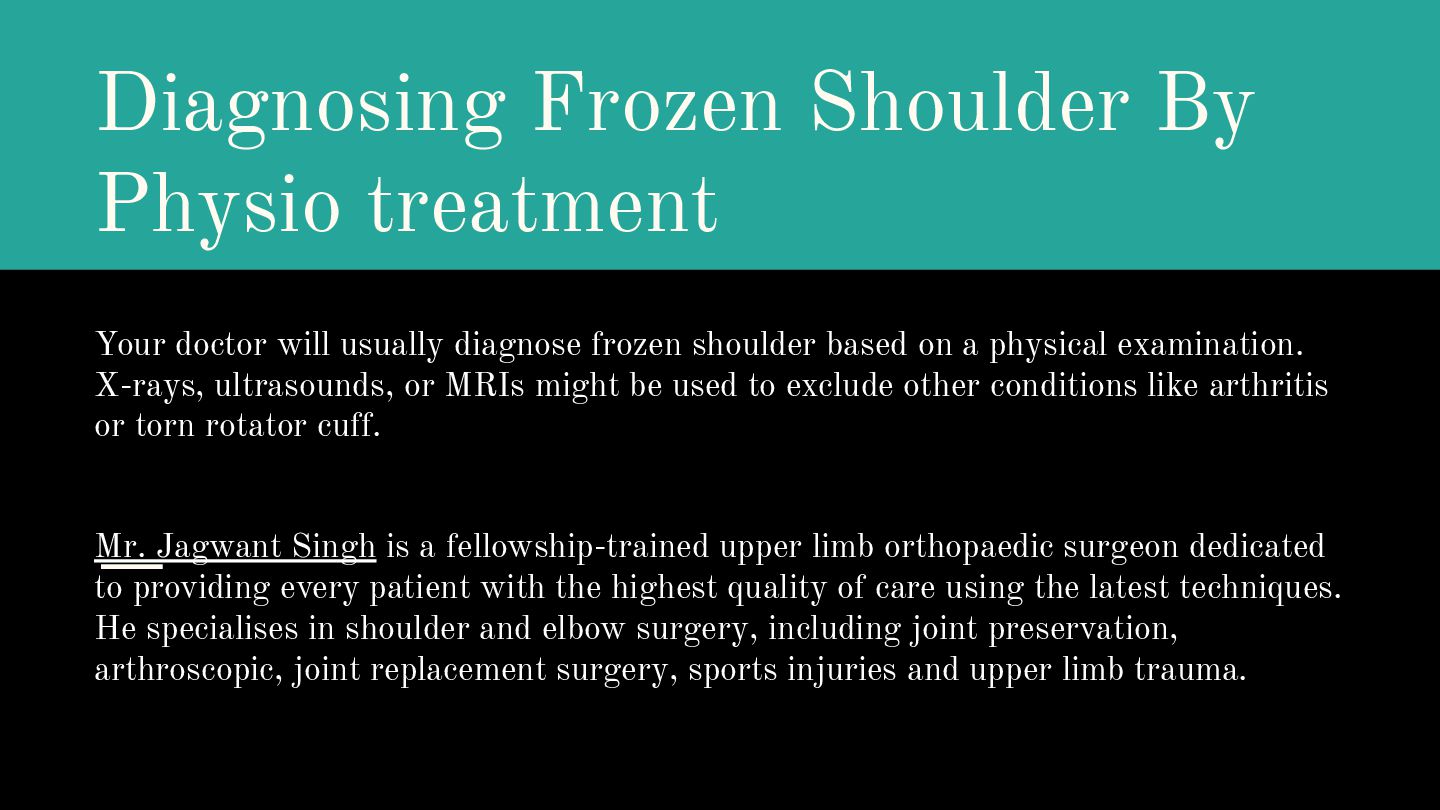 diagnose frozen shoulder based on a physical examination. X-rays, ultrasounds, or MRIs might be used to exclude other conditions like arthritis or torn rotator cuff. Mr. Jagwant Singh is a fellowship-trained upper limb orthopaedic surgeon dedicated to providing every patient with the highest quality of care using the latest techniques. He specialises in shoulder and elbow surgery, including joint preservation, arthroscopic, joint replacement surgery, sports injuries and upper limb trauma.