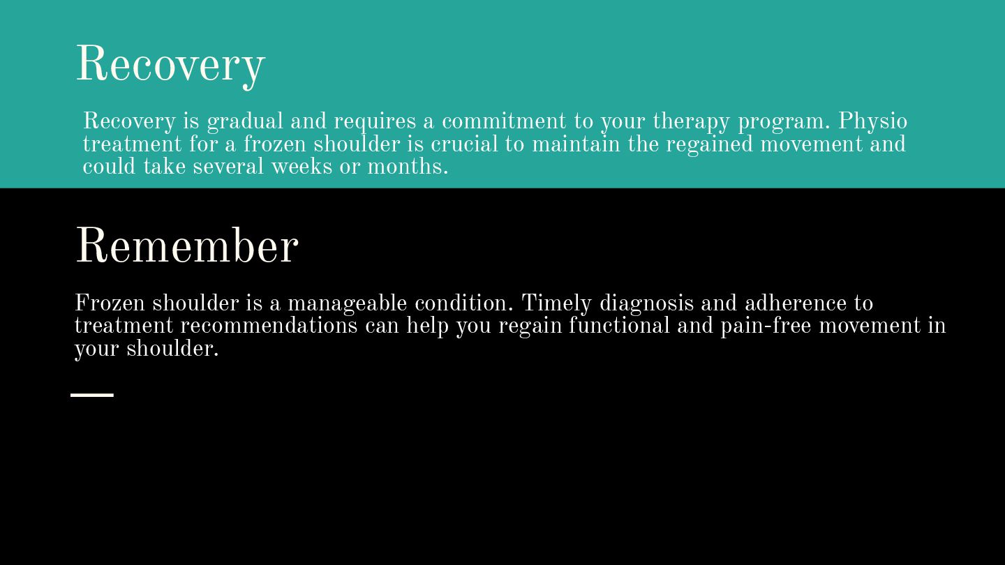 therapy program. Physio treatment for a frozen shoulder is crucial to maintain the regained movement and could take several weeks or months. Frozen shoulder is a manageable condition. Timely diagnosis and adherence to treatment recommendations can help you regain functional and pain-free movement in your shoulder. Remember