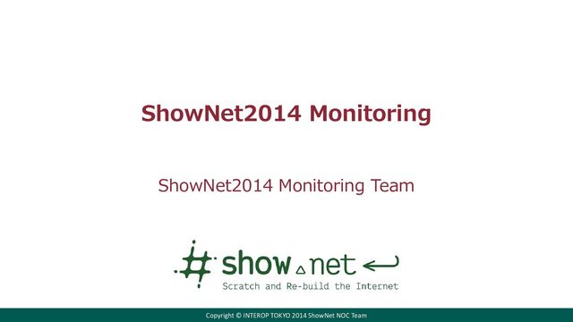 Concept 「監視」「運用」現場の実情 • データ収集の対象となる機器やそのログは サービスの高度化、仮想化を受けて増大の 一途 • 特定ベンダに特化したソリューションや 属人化したツールの横行 • 3ステップのワークフローを再点検 • その上で、 ✓ 徹底的な自動化を行うとともに、 ✓ ログ情報を使い切り、さらなる活用を行う 現状分析し対処に役立てる ・Packet Analyze tool Layer別監視項目明確化 L1: 電力・熱量 L2: Link status L3: Routing status L4 above: Current Session etc. 一般的な監視 as NW観察 ・SNMP ・Syslog ・Configuration 世代管理 ・異常通知solution ShowNet 2014でのチャレンジ supervise observe analyze