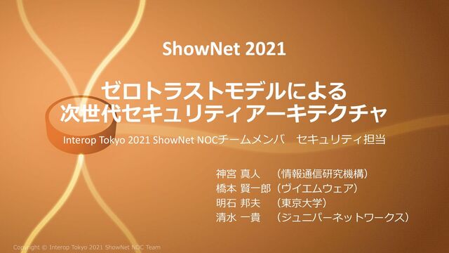 ShowNet 2021 ゼロトラストモデルによる 次世代セキュリティアーキテクチャ Interop Tokyo 2021 ShowNet NOCチームメンバ セキュリティ担当