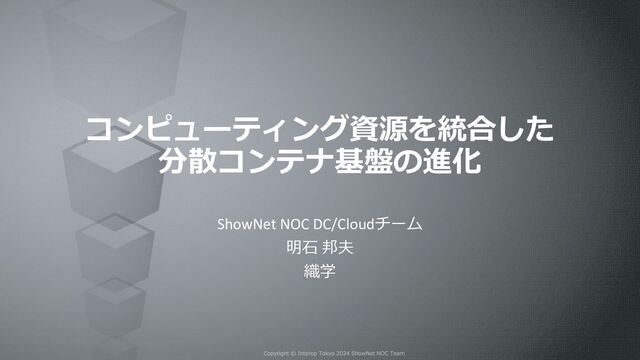 コンピューティング資源を統合した 分散コンテナ基盤の進化 ShowNet NOC DC/Cloudチーム 明石 邦夫 織学
