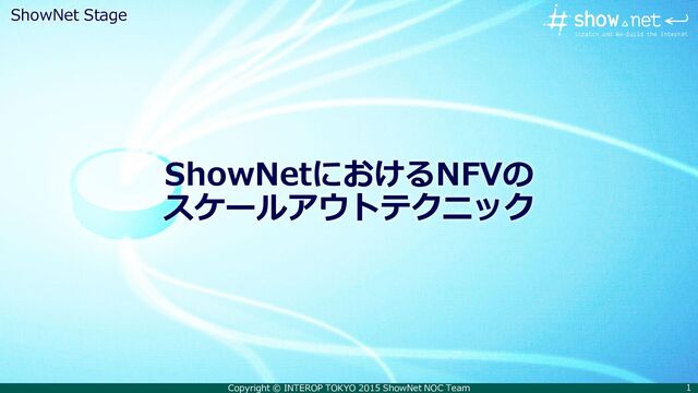 analysis Firewall DDoSミチゲータ vCPE (NAT/ToS) SDN/NFV概要 OpenFlow Switch OpenFlow Switch OpenFlow Switch OpenFlow Switch • vCPEによる出展者収容 • NAT, サービス識別子の付与 • Juniper Networks, vSRX • 3つのVNFの層 • DPI/トラフィック分析 • Paloalto Network, PA-VM • Firewall • Cisco Systems, CSR1000V • DDoS Mitigation • A10 Networks, Thunder 6435tps • OpenFlow Switch • NEC PF5248, PF5459
