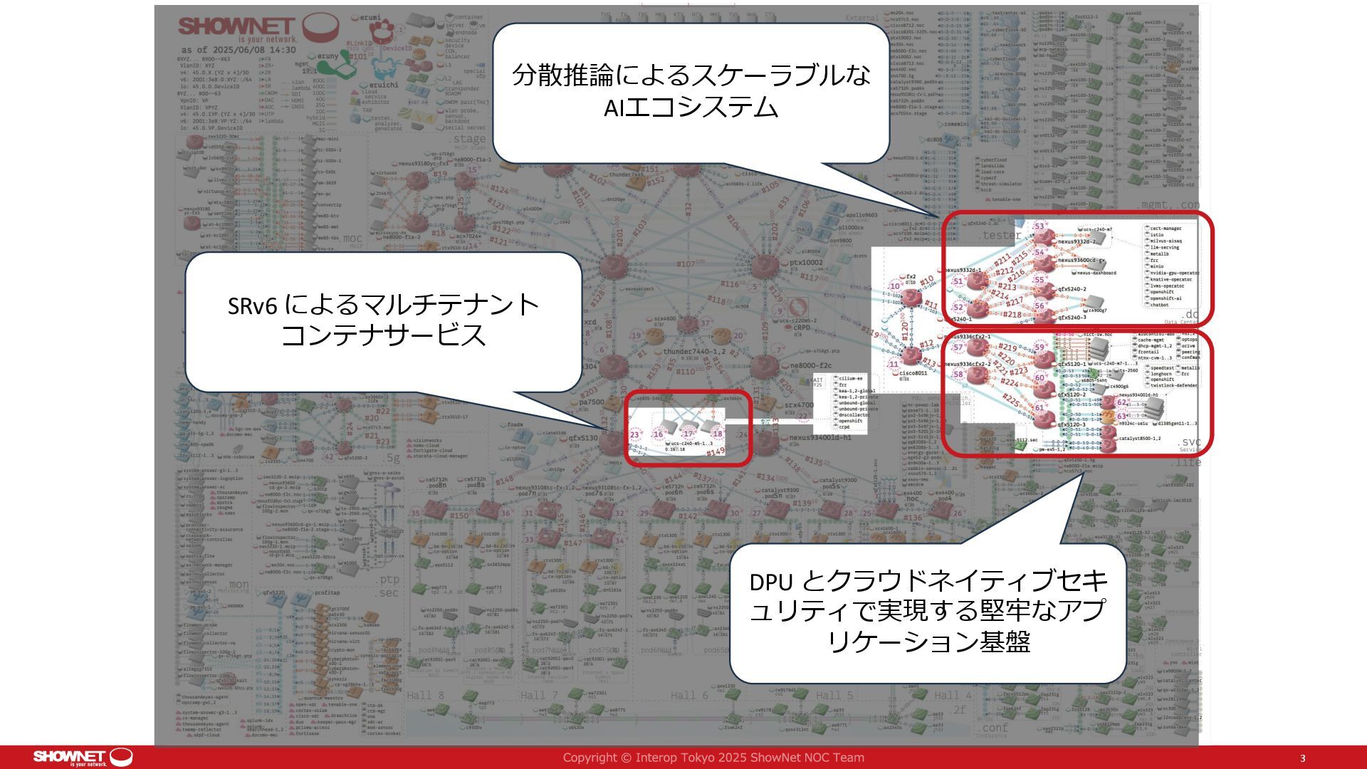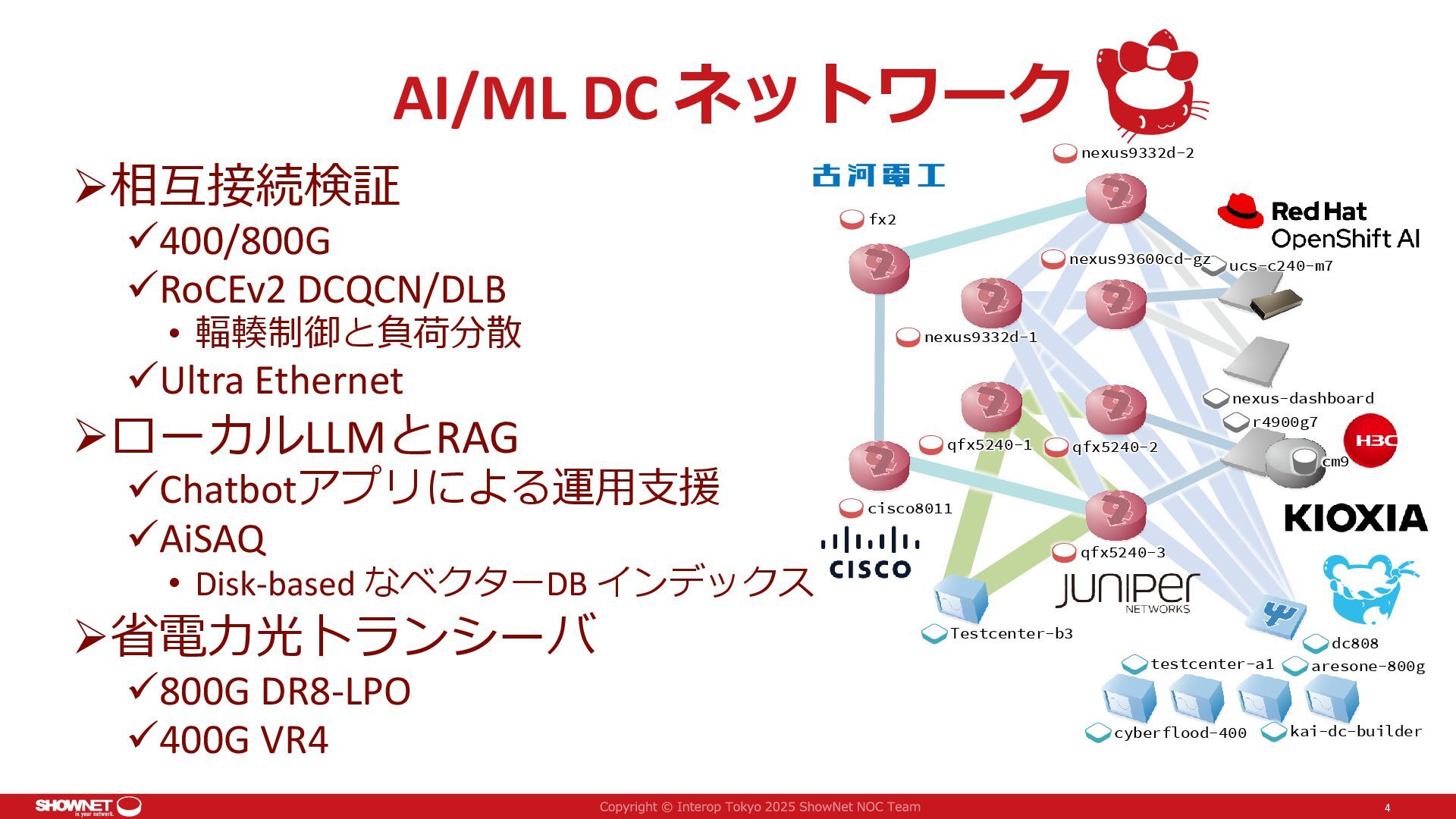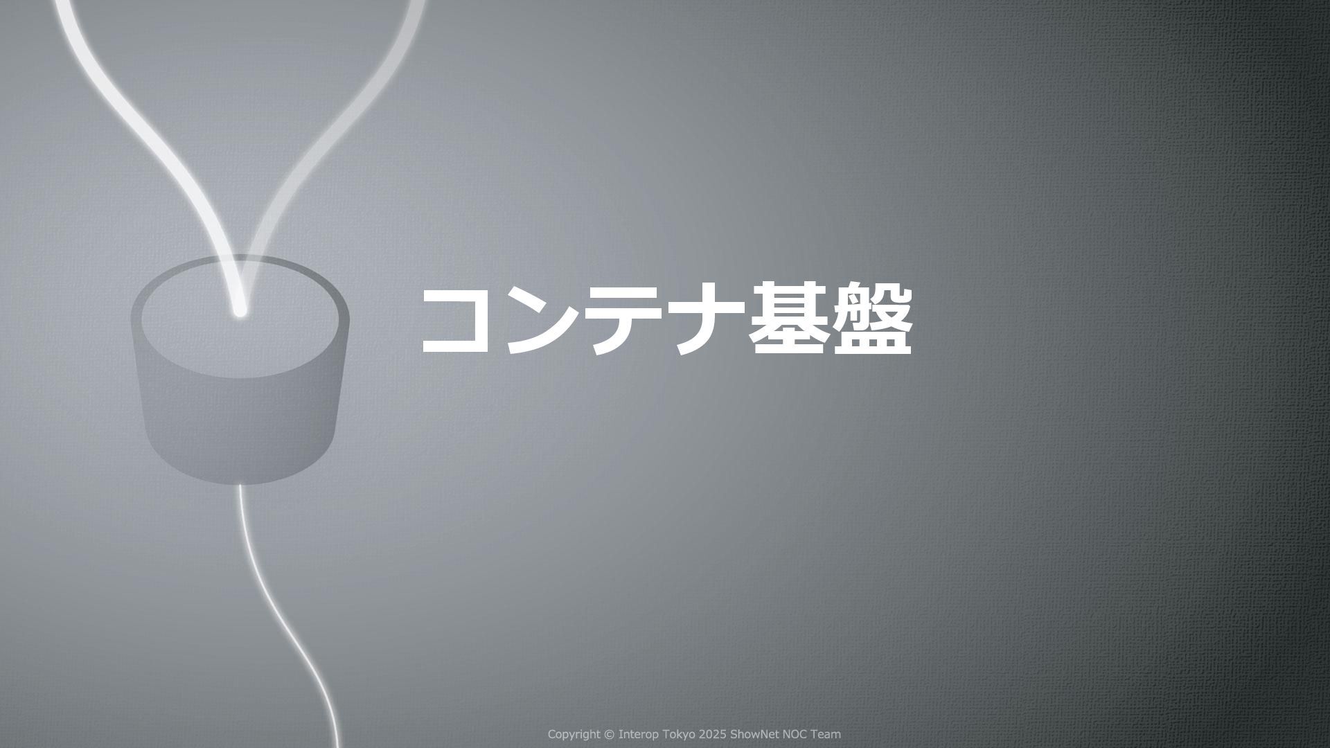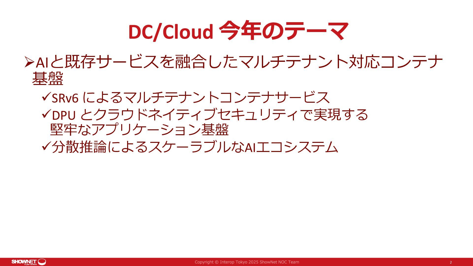 データセンターのサービス基盤は、従来の IaaS 仮想化にコンテナ技術を組み合わせたハイブリッド環境へと移行しつつあります。ShowNet ではこれまで Kubernetes (k8s) を活用しマルチテナント対応のコンテナ基盤を設計・運用してきました。今年の ShowNet では、 SRv6 を用い複数ネットワークを統合的に扱えるコンテナ基盤を構築し実サービスを提供しました。一方、 AI/ML ワークロードを支えるには 400/800G の帯域でも輻輳を抑制できる高度なネットワーク制御が不可欠です。今年は DC/Cloud の新たな取り組みとして AI/ML 基盤向け高速ネットワークとサービス基盤を支える新技術の双方を評価し他サービスとの連携まで実証しました。本セッションでは、 SRv6 で実現したマルチテナント対応コンテナ基盤の構成と AI/ML 向けネットワークの設計・検証結果を解説します。