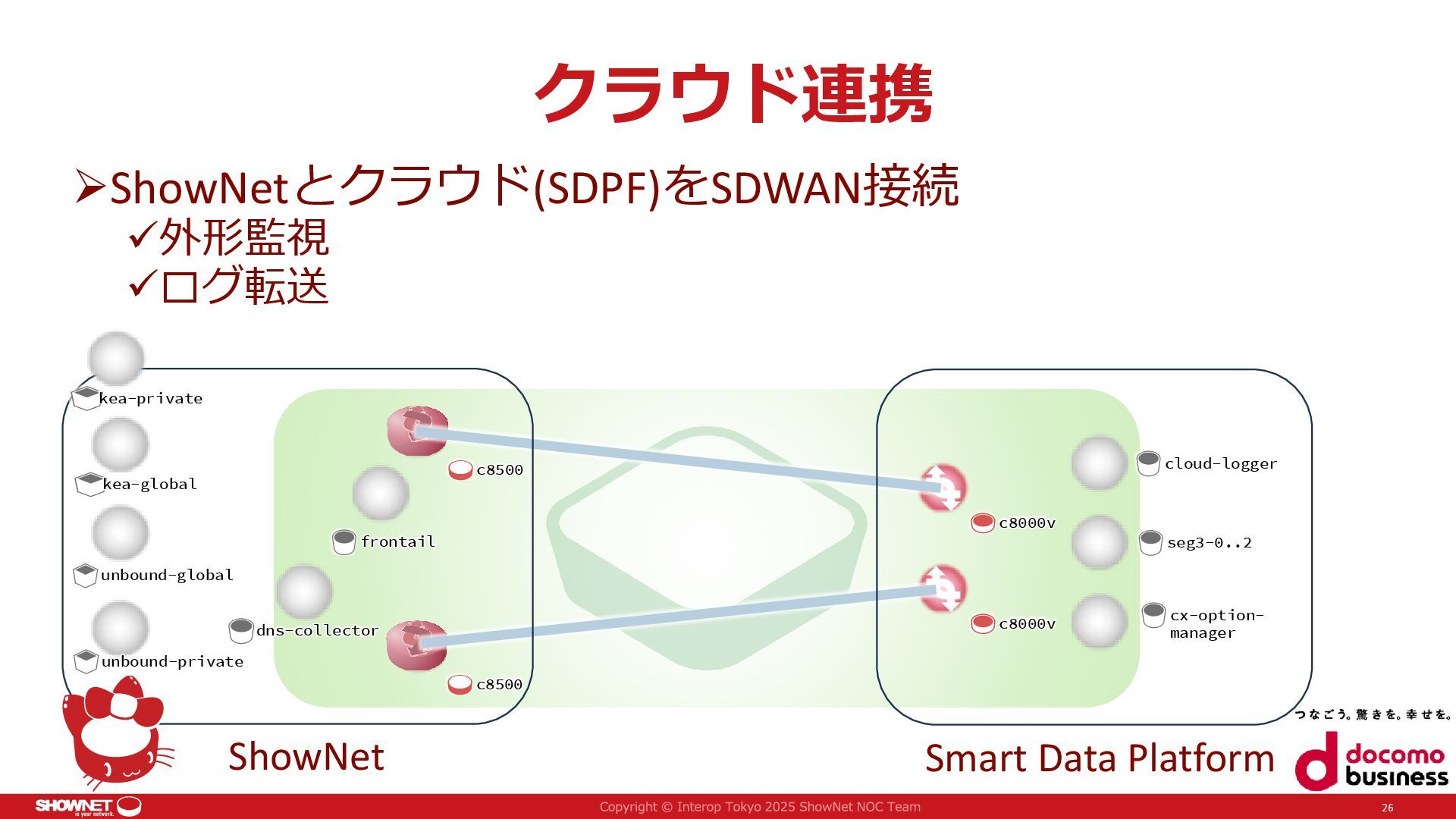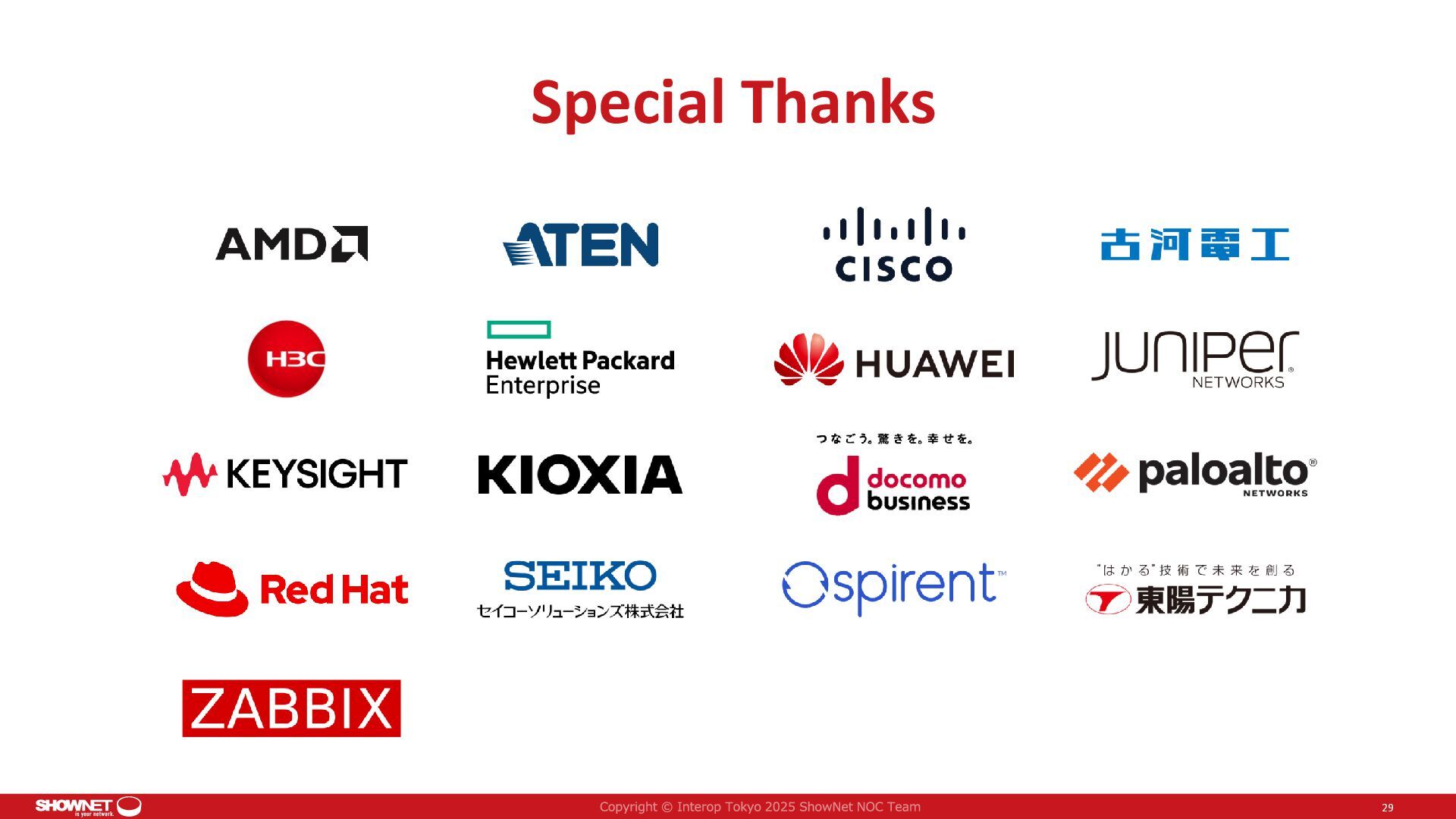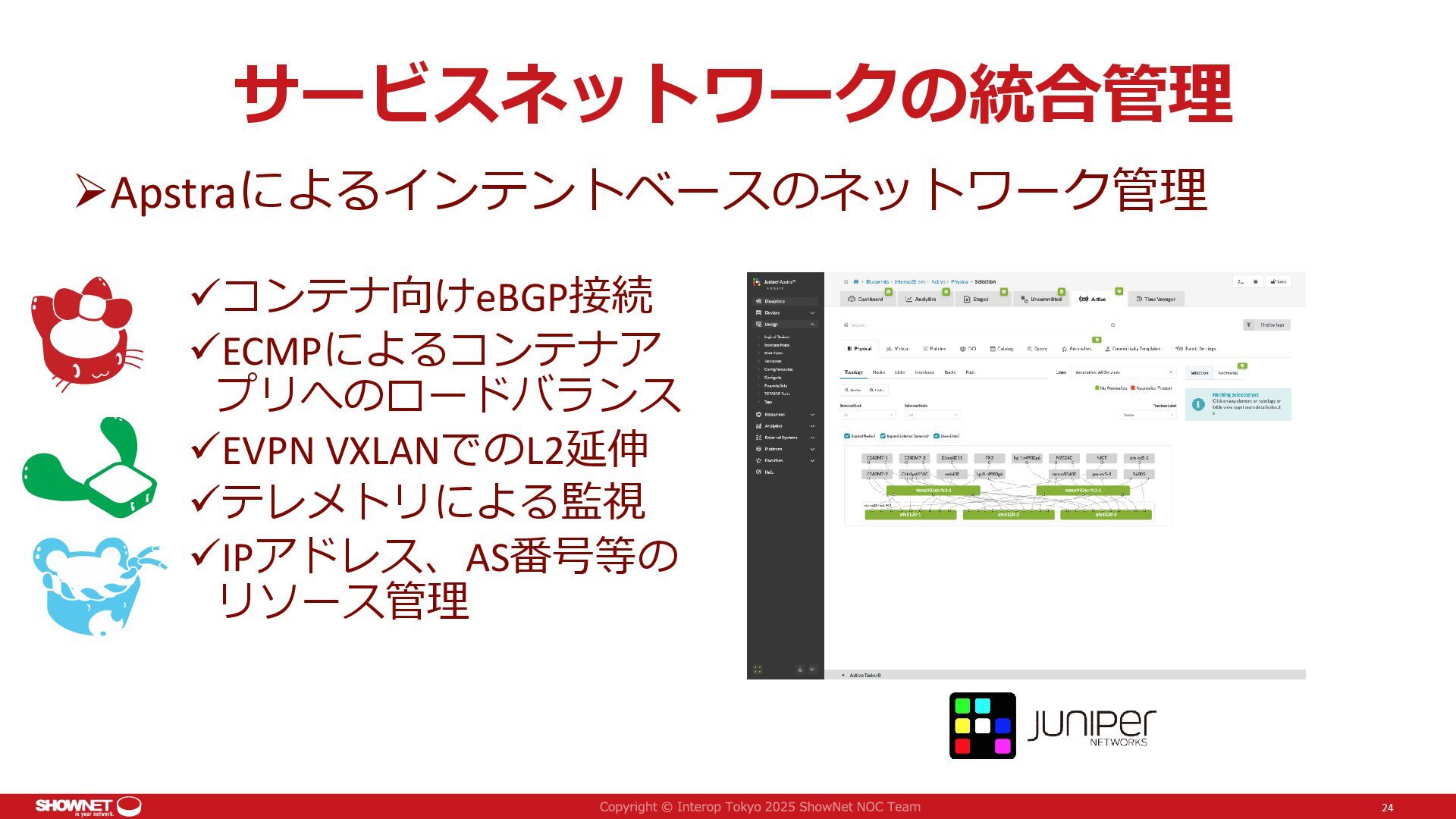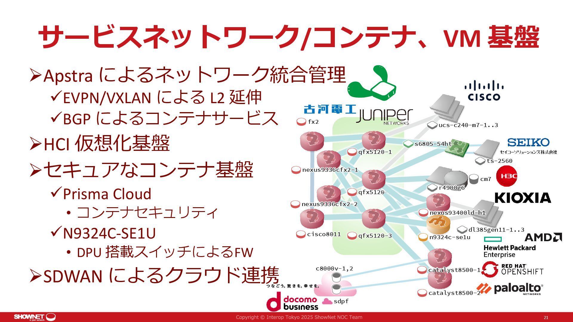 データセンターのサービス基盤は、従来の IaaS 仮想化にコンテナ技術を組み合わせたハイブリッド環境へと移行しつつあります。ShowNet ではこれまで Kubernetes (k8s) を活用しマルチテナント対応のコンテナ基盤を設計・運用してきました。今年の ShowNet では、 SRv6 を用い複数ネットワークを統合的に扱えるコンテナ基盤を構築し実サービスを提供しました。一方、 AI/ML ワークロードを支えるには 400/800G の帯域でも輻輳を抑制できる高度なネットワーク制御が不可欠です。今年は DC/Cloud の新たな取り組みとして AI/ML 基盤向け高速ネットワークとサービス基盤を支える新技術の双方を評価し他サービスとの連携まで実証しました。本セッションでは、 SRv6 で実現したマルチテナント対応コンテナ基盤の構成と AI/ML 向けネットワークの設計・検証結果を解説します。