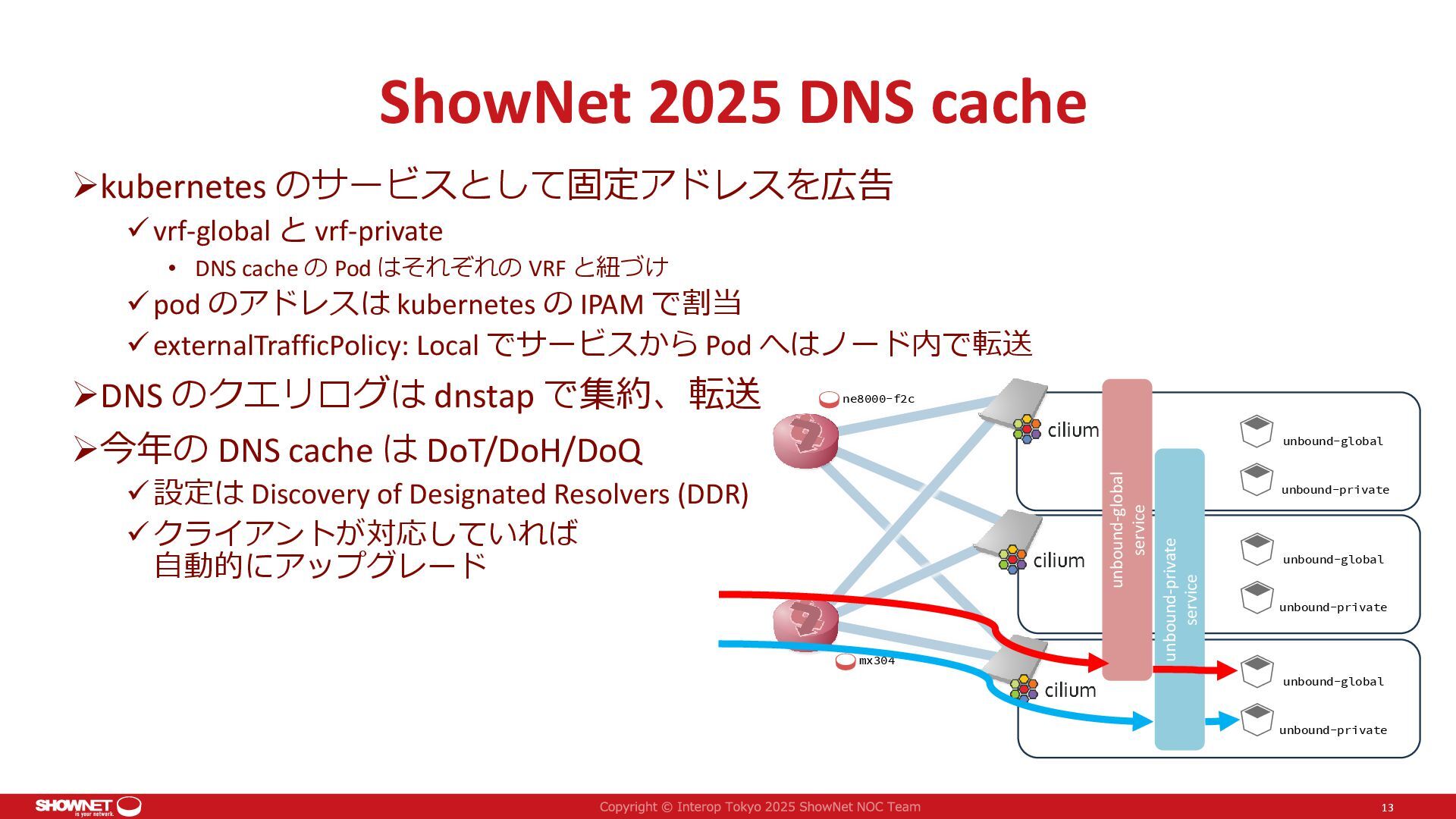 8. ShowNet 2025 DNS cache ➢kubernetes のサービスとして固定アドレスを広告 ✓vrf-global と vrf-private •