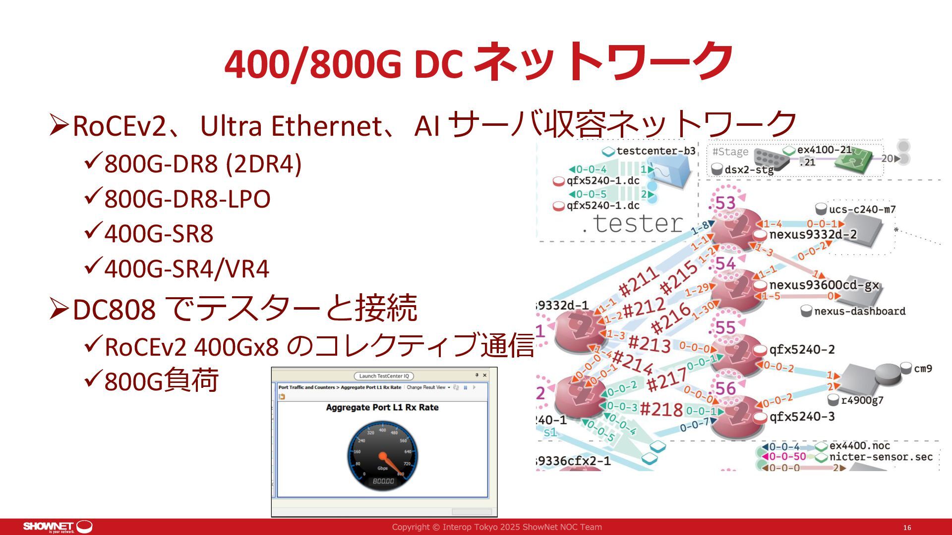 ✓400G-SR4/VR4 ➢DC808 でテスターと接続 ✓RoCEv2 400Gx8 のコレクティブ通信 ✓800G負荷 16