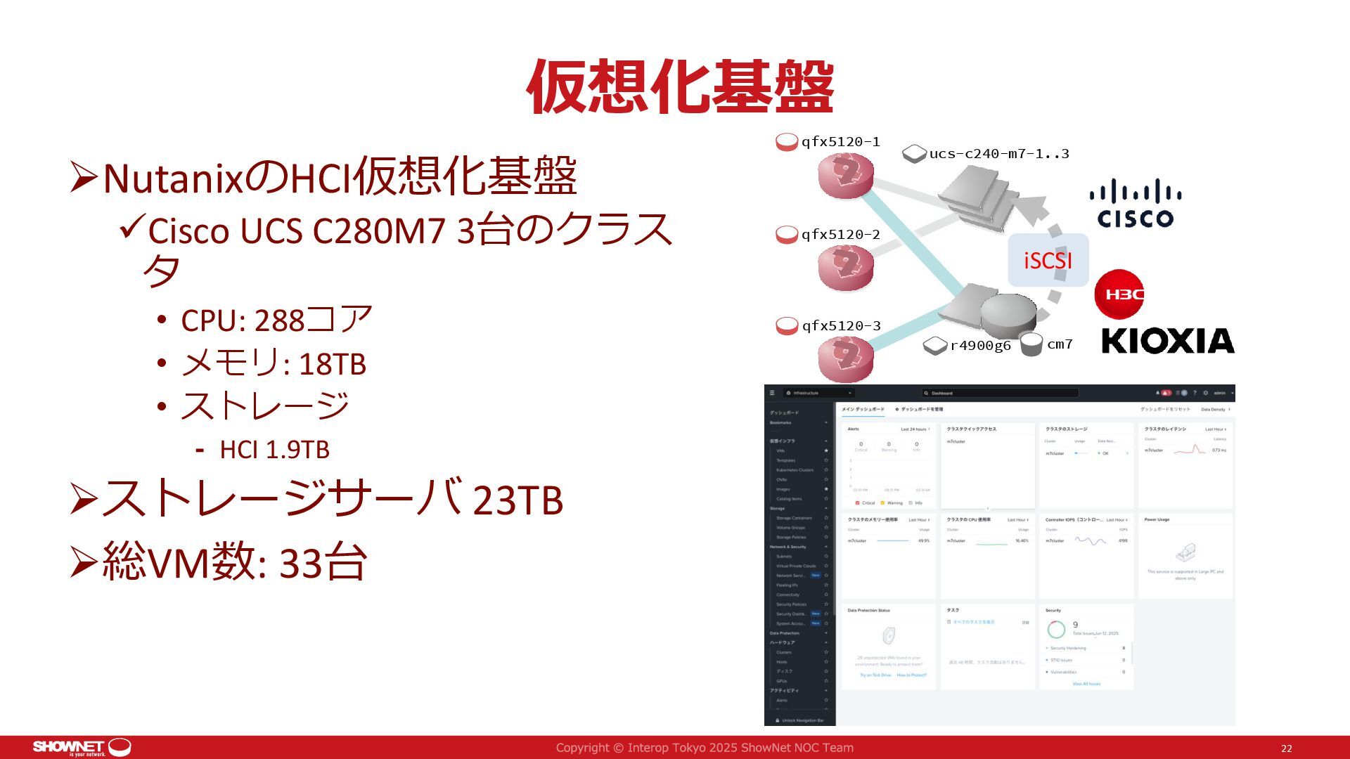• メモリ: 18TB • ストレージ ⁃ HCI 1.9TB ➢ストレージサーバ 23TB ➢総VM数: 33台 22 qfx5120-3 qfx5120-2 qfx5120-1 r4900g6 ucs-c240-m7-1..3 cm7 iSCSI
