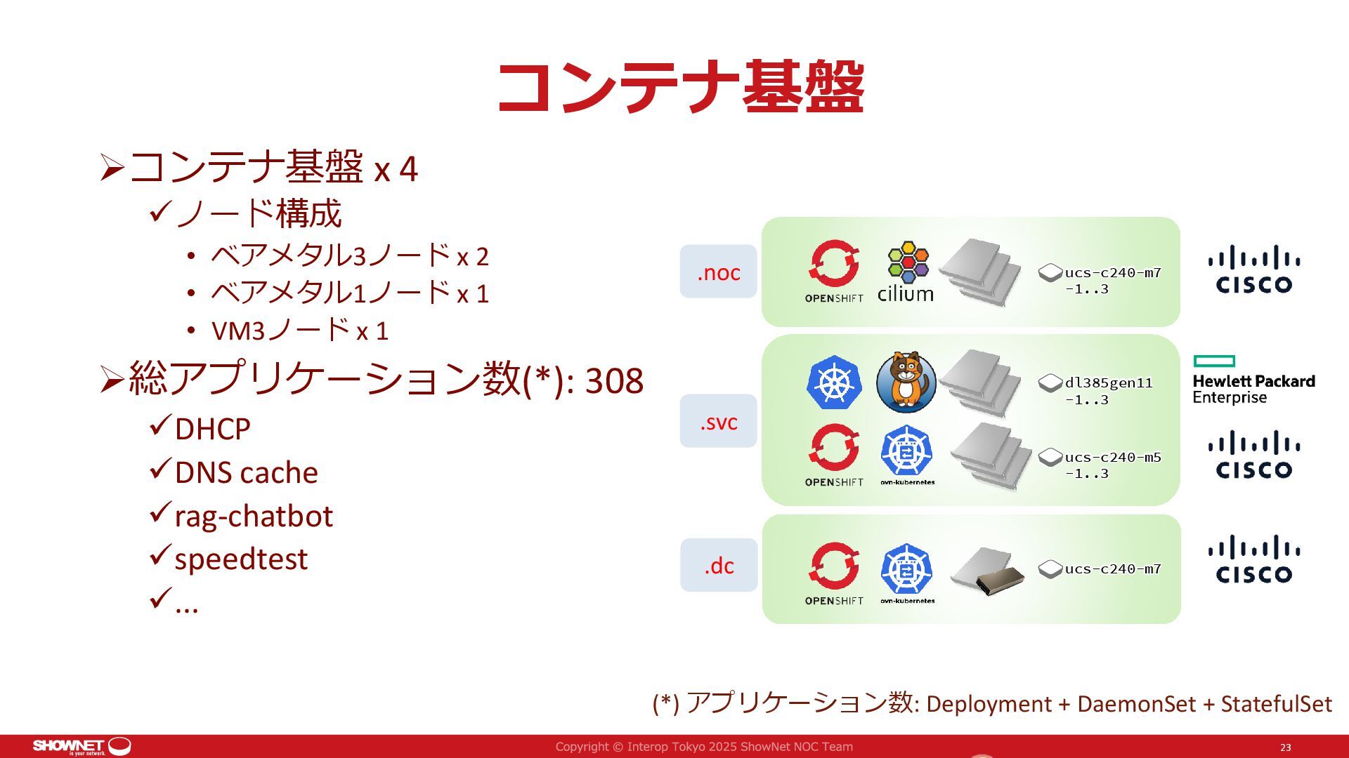 • ベアメタル1ノード x 1 • VM3ノード x 1 ➢総アプリケーション数(*): 308 ✓DHCP ✓DNS cache ✓rag-chatbot ✓speedtest ✓... (*) アプリケーション数: Deployment + DaemonSet + StatefulSet ucs-c240-m7 dl385gen11 -1..3 ucs-c240-m5 -1..3 ucs-c240-m7 -1..3 .noc .svc .dc