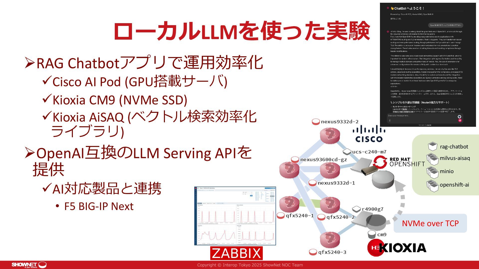 ✓Kioxia AiSAQ (ベクトル検索効率化 ライブラリ) ➢OpenAI互換のLLM Serving APIを 提供 ✓AI対応製品と連携 • F5 BIG-IP Next NVMe over TCP ローカルLLMを使った実験 qfx5240-3 nexus9332d-2 qfx5240-1 qfx5240-2 ucs-c240-m7 r4900g7 cm9 nexus93600cd-gz nexus9332d-1 rag-chatbot milvus-aisaq openshift-ai minio