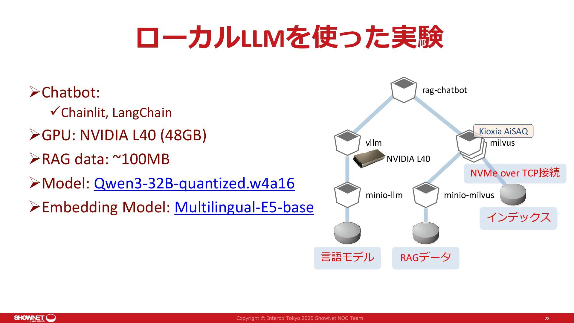 言語モデル RAGデータ NVMe over TCP接続 NVIDIA L40 ➢Chatbot: ✓Chainlit, LangChain ➢GPU: NVIDIA L40 (48GB) ➢RAG data: ~100MB ➢Model: Qwen3-32B-quantized.w4a16 ➢Embedding Model: Multilingual-E5-base