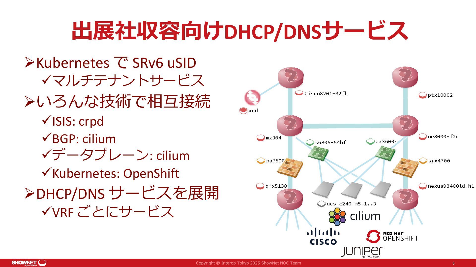 2. 出展社収容向けDHCP/DNSサービス ➢Kubernetes で SRv6 uSID ✓マルチテナントサービス ➢いろんな技術で相互接続 ✓ISIS: crpd ✓BGP:
