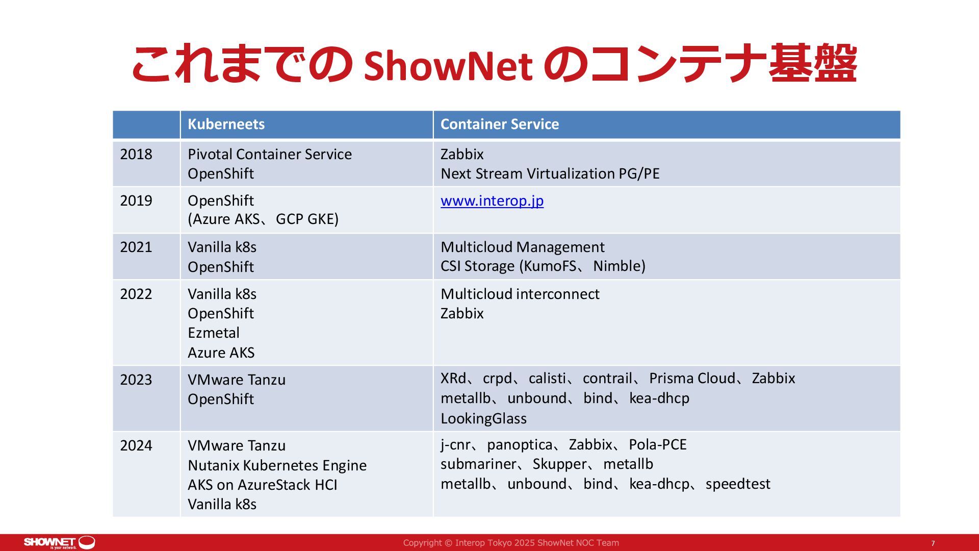 Service OpenShift Zabbix Next Stream Virtualization PG/PE 2019 OpenShift (Azure AKS、GCP GKE) www.interop.jp 2021 Vanilla k8s OpenShift Multicloud Management CSI Storage (KumoFS、Nimble) 2022 Vanilla k8s OpenShift Ezmetal Azure AKS Multicloud interconnect Zabbix 2023 VMware Tanzu OpenShift XRd、crpd、calisti、contrail、Prisma Cloud、Zabbix metallb、unbound、bind、kea-dhcp LookingGlass 2024 VMware Tanzu Nutanix Kubernetes Engine AKS on AzureStack HCI Vanilla k8s j-cnr、panoptica、Zabbix、Pola-PCE submariner、Skupper、metallb metallb、unbound、bind、kea-dhcp、speedtest