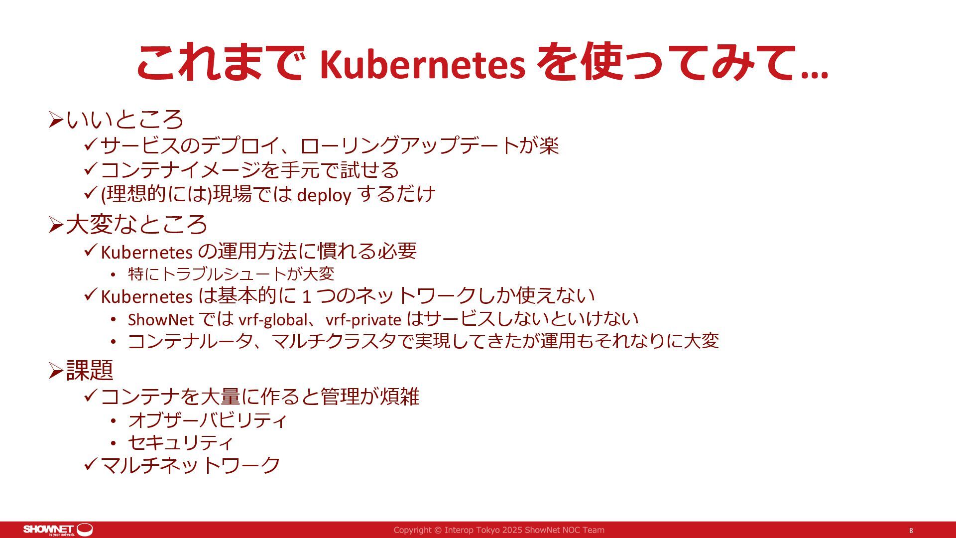✓Kubernetes の運用方法に慣れる必要 • 特にトラブルシュートが大変 ✓Kubernetes は基本的に 1 つのネットワークしか使えない • ShowNet では vrf-global、vrf-private はサービスしないといけない • コンテナルータ、マルチクラスタで実現してきたが運用もそれなりに大変 ➢課題 ✓コンテナを大量に作ると管理が煩雑 • オブザーバビリティ • セキュリティ ✓マルチネットワーク 8