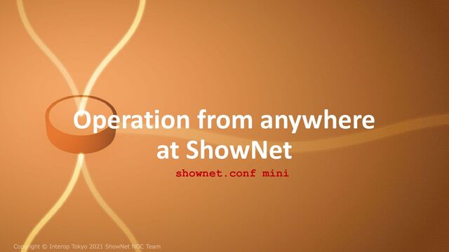 Audit logの収集 Operation from anywhere オペレータ ShowNetを守る ShowNetに繋がる全てを守る リモートオペレーションで は、オペレータと同じポリ シーで実施 全てのトラフィックのセ キュリティチェック NOC 全てのトラフィックのセ キュリティチェック 出展社・来場者 クローズド、グローバルに 関係なく、脆弱性スキャン を実施 脆弱性がある場合には、修 正、パッチ適用、または仮 想パッチ対応など、状況に 応じて対策を実施 全体